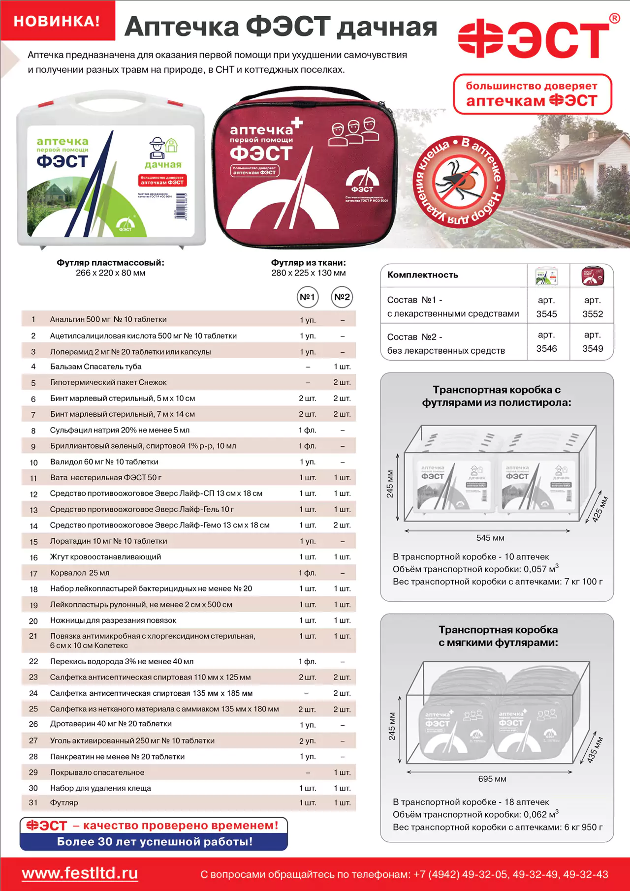 Состав комплектации №1: Анальгин 500 мг №10, Ацетилсалициловая кислота 500 мг №10, Лоперамид 2 мг №20, Бальзам Спасатель, Гипотермический пакет Снежок (2 шт.), Бинт марлевый стерильный 5 м х 10 см (2 шт.), Бинт марлевый стерильный 7 м х 14 см (2 шт.), Сульфацил натрия 20% фл., Бриллиантовый зеленый 1% фл., Валидол 60 мг №10, Вата нестерильная 50 г, Средство противоожоговое Эверс Лайф-СП 13 см х 18 см, Средство противоожоговое Эверс Лайф-Гель 10 г, Средство противоожоговое Эверс Лайф-Гемо 13 см х 18 см, Лоратадин 10 мг №10, Жгут кровоостанавливающий, Корвалол 25 мл, Лейкопластырь бактерицидный №20, Лейкопластырь рулонный 2 см х 500 см, Ножницы, Повязка антимикробная с хлоргексидином 6 см х 10 см, Перекись водорода 3% фл., Салфетка антисептическая спиртовая (2 шт.), Салфетка с аммиаком (2 шт.), Дротаверин 40 мг №20, Уголь активированный 250 мг №10 (2 уп.), Панкреатин №20, Набор для удаления клеща.