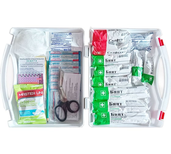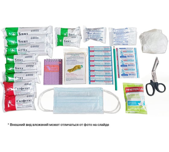 Состав: Маска медицинская нестерильная одноразовая – 2 шт. Перчатки медицинские нестерильные, размером не менее М – 2 пары. Устройство для проведения искусственного дыхания «Рот-устройство-рот» – 2 шт. Жгут кровоостанавливающий для остановки артериального кровотечения – 1 шт. Бинт марлевый медицинский размером не менее 5 м х 5см или бинт фиксирующий эластичный нестерильный размером не менее 2 м х 5 см – 2 шт. Бинт марлевый медицинский размером не менее 5 м х 10 см или бинт фиксирующий эластичный нестерильный размером не менее 2 м х 10 см – 3 шт. Бинт марлевый медицинский размером не менее 7 м х 14 см или бинт фиксирующий эластичный нестерильный размером не менее 2 м х 14 см – 3 шт. Салфетки марлевые медицинские стерильные, размером не менее 16 х 13 см №10 – 2 уп. Лейкопластырь фиксирующий рулонный размером не менее 2 х 500 см – 1 шт. Лейкопластырь бактерицидный размером не менее 1,9 х 7,2 см – 20 шт. Лейкопластырь бактерицидный размером не менее 4 х 10 см – 4 шт. Покрывало спасательное изотермическое размером не менее 160 см х 210 см – 1 шт. Ножницы для разрезания перевязочного материала и ткани – 1 шт. Инструкция по оказанию первой помощи с использованием аптечки для оказания первой помощи с применением медицинских изделий в организациях, осуществляющих образовательную деятельность – 1 шт. Блокнот формата не менее A7 – 1 шт. Маркер черный (синий) или карандаш – 1 шт. Футляр – 1 шт.