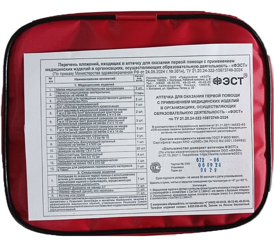 Аптечка для оказания первой помощи с применением медицинских изделий в организациях, осуществляющих образовательную деятельность - "ФЭСТ" в сумке-футляре 0370/1 предназначена для оказания неотложной медицинской помощи вне медицинских учреждений. Комплектация соответствует требованиям приказа Минздрава РФ от 24.05.2024 г. №261н. Изделие доступно оптом, поставляется напрямую от производителя с возможностью доставки по всей РФ.Характеристики