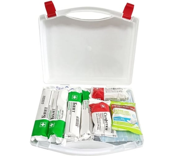 Состав: Маска медицинская нестерильная одноразовая – 2 шт. Перчатки медицинские нестерильные, размером не менее М – 2 пары. Устройство для проведения искусственного дыхания «Рот-Устройство-Рот» (изделие одноразовое) – 2 шт. Жгут кровоостанавливающий для остановки артериального кровотечения – 1 шт. Бинт марлевый медицинский размером не менее 5 м × 10 см или бинт фиксирующий эластичный нестерильный размером не менее 2 м х 10 см – 4 шт. Бинт марлевый медицинский размером не менее 7 м × 14 см или бинт фиксирующий эластичный нестерильный размером не менее 2 м х 14 см – 4 шт. Салфетки медицинские стерильные размером не менее 16 × 13 см №10 – 2 уп. Лейкопластырь фиксирующий рулонный размером не менее 2 × 500 см – 1 шт. Лейкопластырь бактерицидный размером не менее 1,9 х 7,2 см – 10 шт. Лейкопластырь бактерицидный размером не менее 4 х 10 см – 2 шт. Покрывало спасательное изотермическое размером не менее 160 × 210 см – 2 шт. Ножницы для разрезания перевязочного материала и ткани – 1 шт. Инструкция по оказанию первой помощи с использованием аптечки для оказания работниками первой помощи пострадавшим с применением медицинских изделий – 1 шт. Блокнот формата не менее А7 – 1 шт. Маркер черный (синий) или карандаш – 1 шт. Футляр из пластмассы размером 266×220×80 мм – 1 шт.