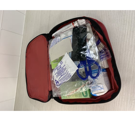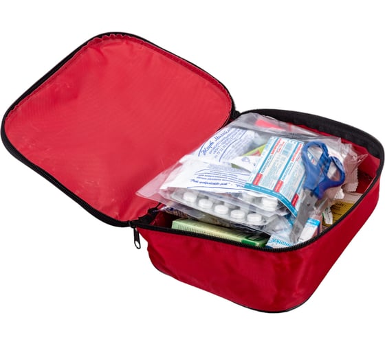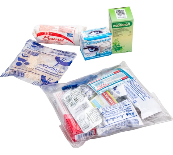 Комплектация: Салфетка для стимуляции дыхания (с аммиаком), Ацетилсалициловая кислота 500 мг №10, Бинт марлевый нестерильный 5 м х 10 см, Бинт марлевый нестерильный 5 м х 5 см, Бинт марлевый стерильный 5 м х 10 см, Бинт эластичный трубчатый медицинский нестерильный №1, 3, 6, Бриллиантового зелёного раствор 1% 10 мл, Валидол 60 мг №10, Ванночка глазная, Вата медицинская стерильная 25 г, Жгут кровоостанавливающий, Корвалол 15 мл, Лейкопластырь бактерицидный 1.9 х 7.2 см (4 шт.), Лейкопластырь рулонный 1 х 250 см, Нитроглицерин 0.5 мг №20 или №40 табл., Ножницы, Гипотермический пакет «Снежок», Салфетка «Колетекс» СХГ-1 с хлоргексидином 6 х 10 см, Салфетка «Колетекс» с фурагином 6 х 10 см №3, Салфетка «Колетекс» СПФ-1 с прополисом и фурагином 6 х 10 см, Уголь активированный 250 мг №10, Устройство для проведения искусственного дыхания «Рот-Устройство-Рот», Анальгин 500 мг №10