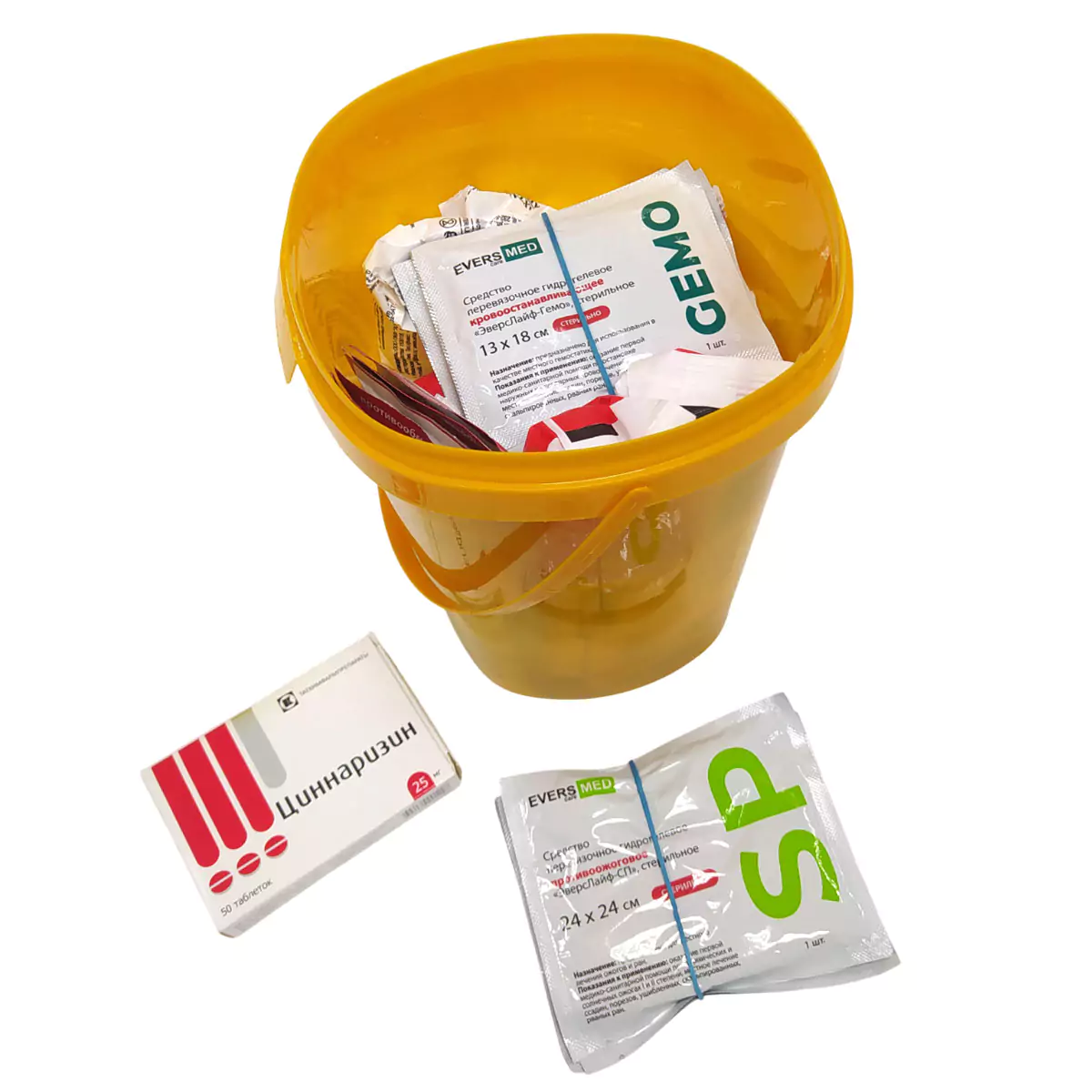 Состав: Анальгин 500 мг №10, табл. (2 уп.), Ацетилсалициловая кислота 500 мг №10, табл. (2 уп.), Пакет перевязочный с одной подушечкой (2 шт.), Бинт марлевый медицинский 5 м х 10 см (2 шт.), Бинт марлевый медицинский 7 м х 14 см (2 шт.), Жгут кровоостанавливающий (1 шт.), Салфетки марлевые медицинские стерильные 16 х 14 см №10 (3 уп.), Средство перевязочное гидрогелевое кровоостанавливающее «Эверс Лайф-Гемо», стерильное 13 х 18 см (4 шт.), Средство перевязочное гидрогелевое противоожоговое «Эверс Лайф-СП», стерильное 24 х 24 см (4 шт.), Валидол с глюкозой 60 мг №10, табл. (2 уп.), Циннаризин 25 мг №50, табл. (1 уп.), Салфетка из нетканого материала с аммиаком (5 шт.), Хлоргексидина раствор 0,05%, 100 мл (2 фл.), Ножницы (1 шт.)