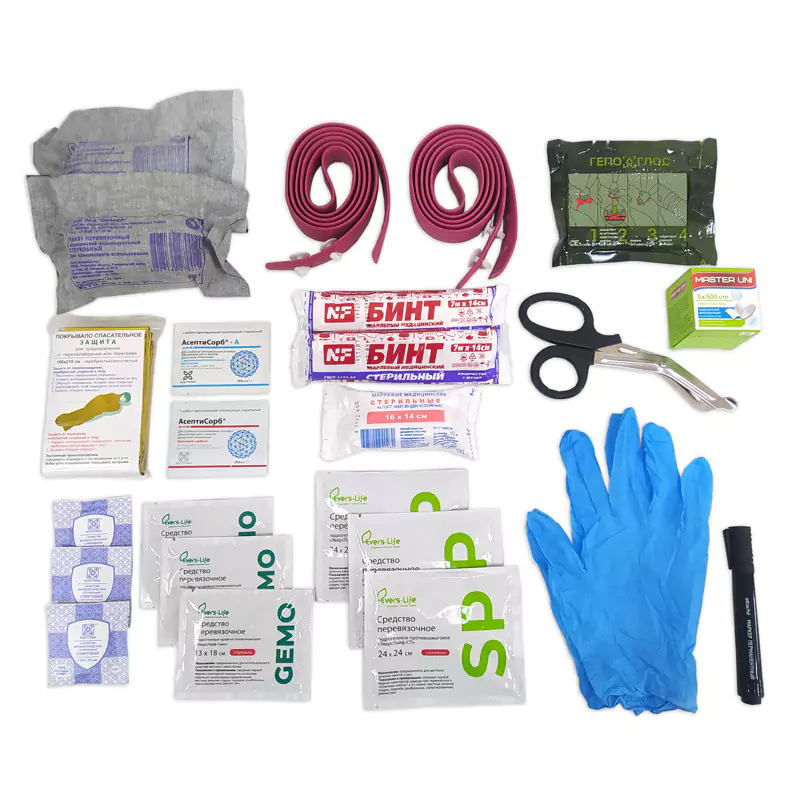 Комплектация: Жгут кровоостанавливающий резиновый (2 шт.), средство перевязочное противоожоговое стерильное 24х24 см (4 шт.), средство перевязочное кровоостанавливающее стерильное 13х18 см (4 шт.), средство гемостатическое антимикробное (бинт 7.5х100 см) (1 шт.), бинт марлевый стерильный 7х14 см (2 шт.), пакет перевязочный стерильный (2 шт.), ножницы тактические (1 шт.), Нефопам в шприц-тюбике (1 уп.), перчатки нитриловые (2 пары), салфетки антисептические спиртовые (3 шт.), покрывало спасательное (1 шт.), маркер (1 шт.)