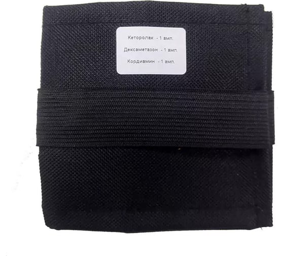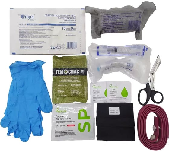 Основные позиции комплектации: Жгут кровоостанавливающий, средство противоожоговое стерильное, средство гемостатическое стерильное, воздуховод Гведела, пакет перевязочный стерильный, ножницы, инъекционные препараты (Кеторолак, Дексаметазон, Кордиамин) в ампульнице, шприц 5 мл, перчатки, салфетки антисептические