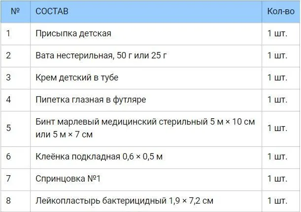 Состав: Детская присыпка (1 шт.), Вата нестерильная (1 шт., 50 г или 25 г), Детский крем (1 шт.), Глазная пипетка в футляре (1 шт.), Бинт марлевый стерильный (1 шт., 5 м × 10 см или 5 м × 7 см), Полиэтиленовая пленка (1 шт., 0,6 × 0,5 м), Спринцовка №1 (1 шт.), Лейкопластырь бактерицидный (1 шт., 1,9 × 7,2 см)