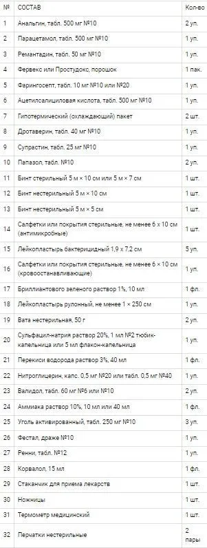 Комплектация: Универсальный набор медикаментов и вспомогательных средств для оказания первой помощи