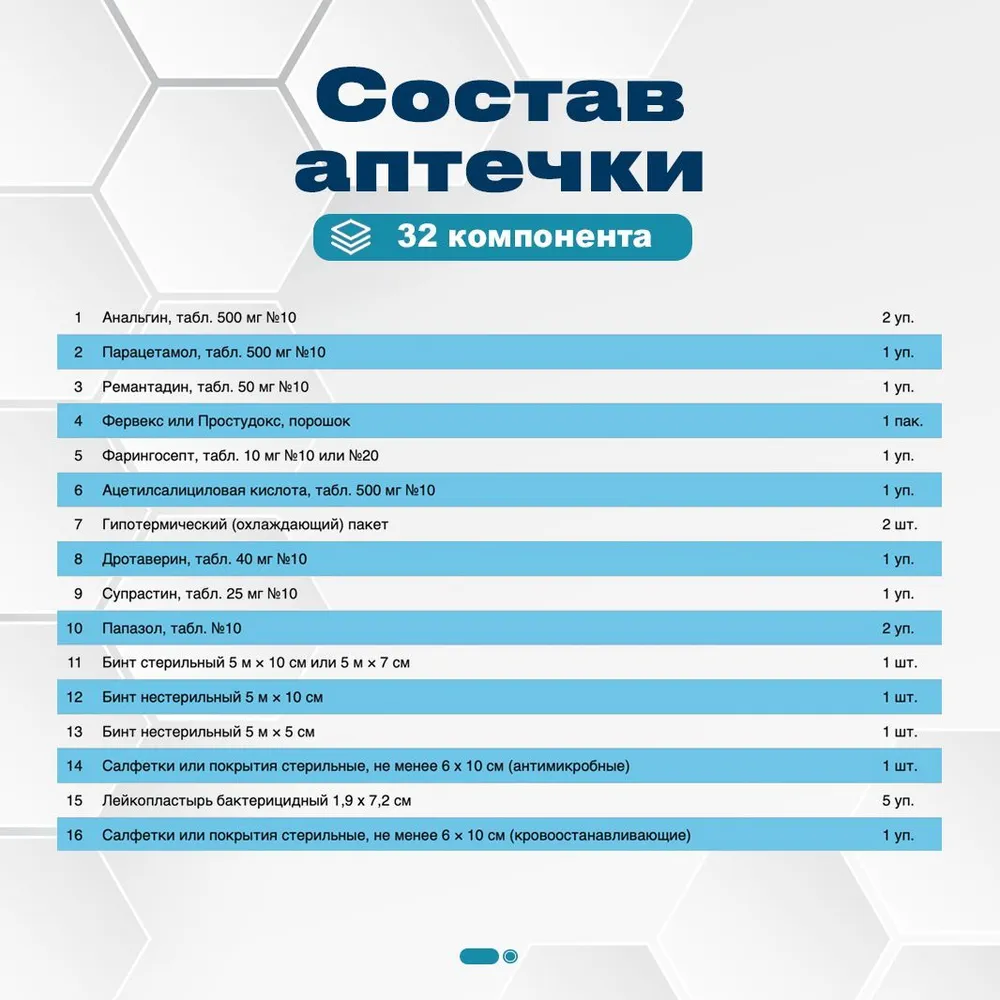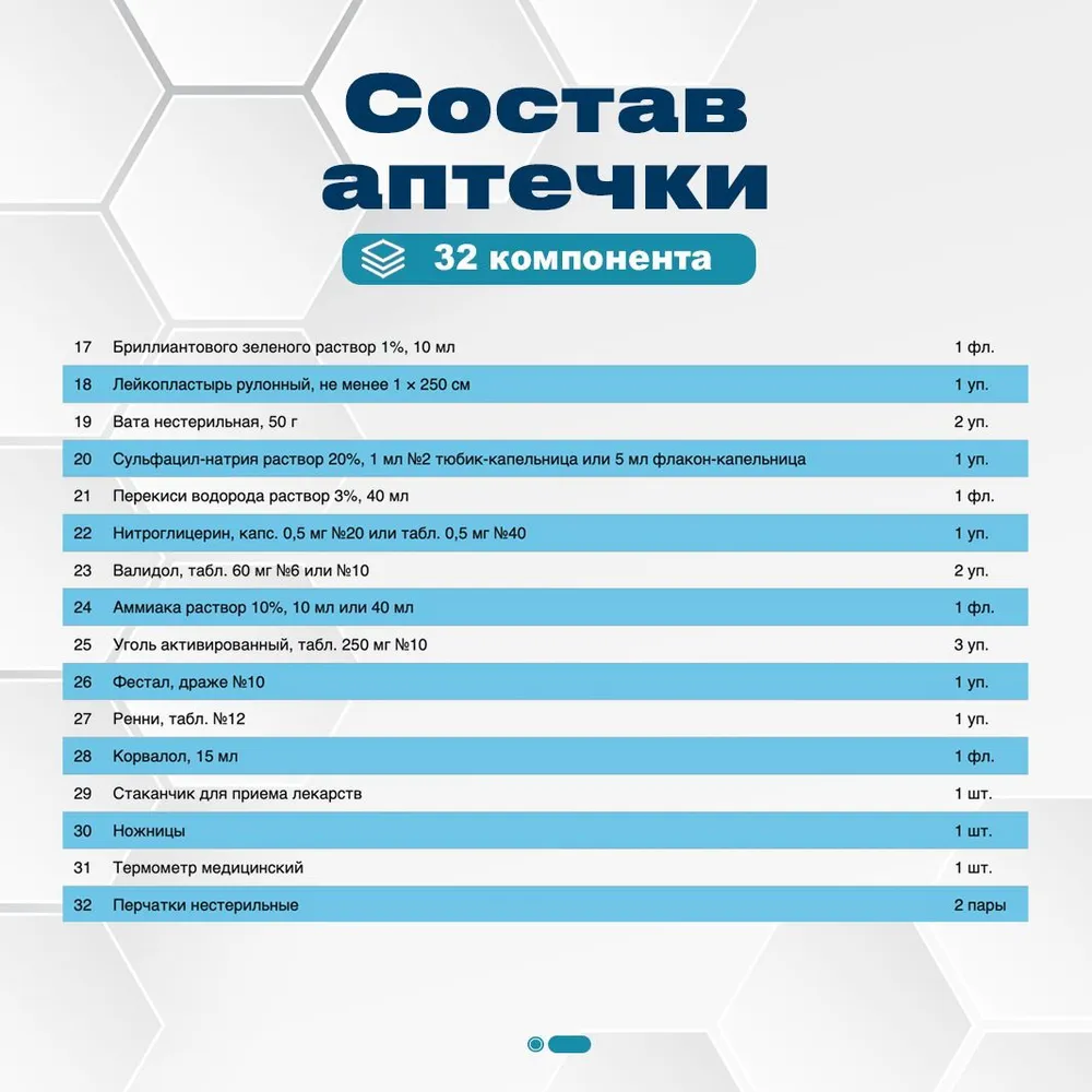 Комплектация: Универсальный набор для оказания первой помощи, 32 наименования