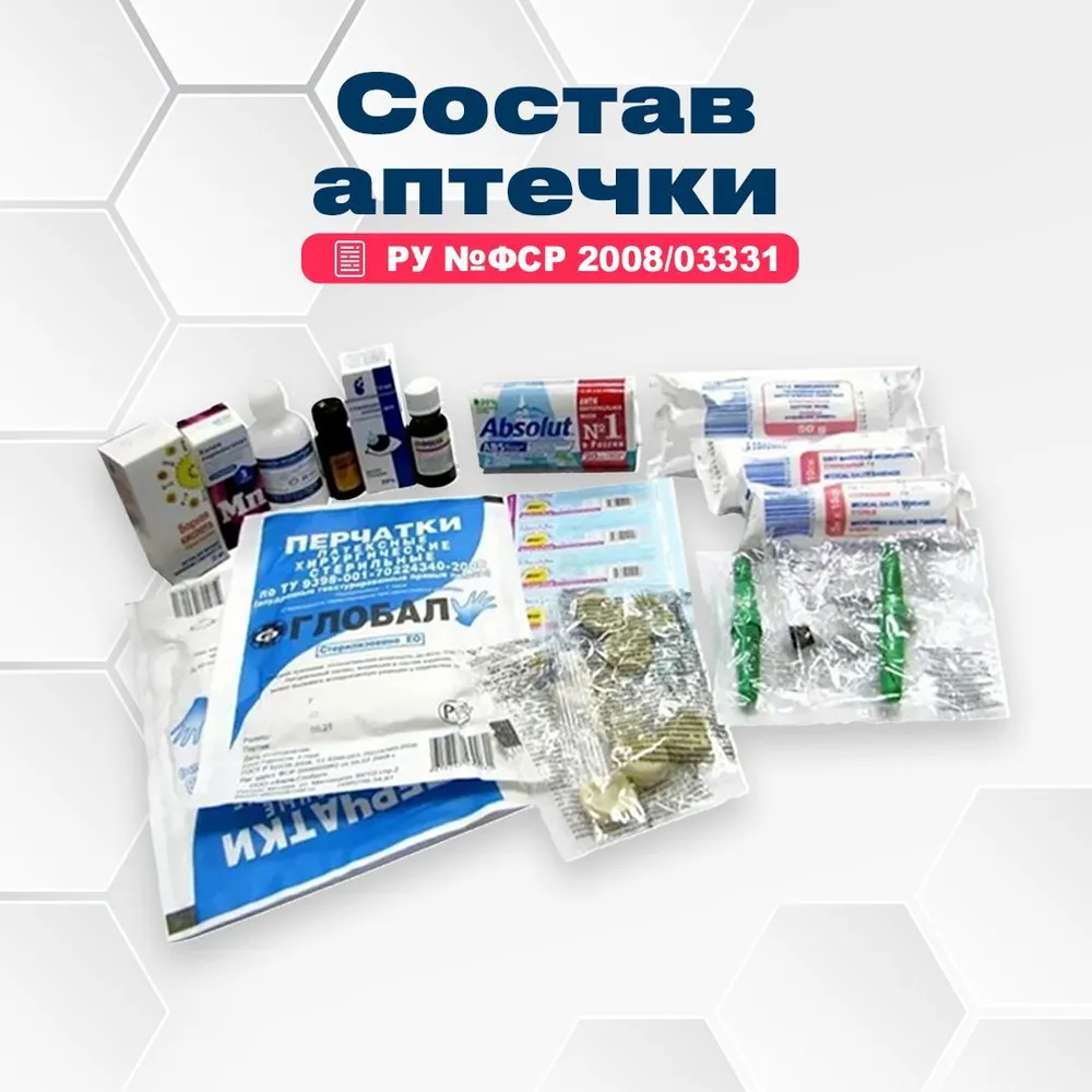 Состав: Раствор йода спиртовой 5% 10 мл (1 шт.), Калия перманганат 3 г (1 уп.), Борная кислота 3% спиртовой раствор 25 мл (1 фл.), Сульфацил-натрия раствор 20% 1 мл №2 или 5 мл (2 уп./1 фл.), Вата стерильная 50 г (1 шт.), Бинт стерильный 5 м × 10 см или салфетки стерильные 16 × 14 см №10 (2 уп.), Лейкопластырь бактерицидный 1,9 × 7,2 см (10 шт.), Пипетка глазная в футляре (2 шт.), Перекиси водорода раствор 3% 40 мл (1 фл.), Перчатки хирургические стерильные (2 пары), Аммиака раствор 10% 10 мл или 40 мл (1 фл.), Напальчник (10 шт.), Мыло антибактериальное (1 шт.)