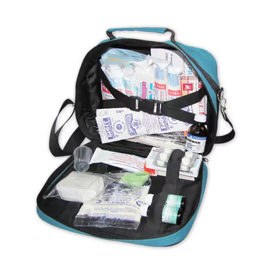 Состав: Анальгин, табл. 500 мг №10 – 2 уп. Гипотермический (охлаждающий) пакет – 3 уп. Жгут кровоостанавливающий – 1 шт. Бинт стерильный 5 м × 10 см или 5 м × 7 см – 3 шт. Бинт стерильный 7 м × 14 см – 3 шт. Бинт нестерильный 5 м × 10 см – 2 шт. Атравматическая антимикробная салфетка 6 x 10 см №1 – 10 шт. Салфетки антисептические спиртовые – 20 шт. Кровоостанавливающая салфетка стерильная 6 x 10 см №3 или салфетка марлевая стерильная 5 × 5 см – 10 шт. Раствор йода спиртовой 5%, 10 мл – 2 фл. Лейкопластырь 1 × 250 см – 2 шт. Бинт эластичный трубчатый медицинский нестерильный №6 – 2 шт. Вата нестерильная, 50 г – 2 уп. Сульфацил-натрия раствор 20%, 1 мл №2 тюбик-капельница или 5 мл флакон-капельница или по 10 мл – 2 уп. Перекиси водорода раствор 3% — 40 мл – 2 фл. Спрей «Олазоль» или Д-Пантенол мазь 5%, 25 г или Пантенол-ратиофарм 5% — 35 г – 1 шт. Нитроглицерин, капс. 0,5 мг №20 или табл. 0,5 мг №40 – 1 уп. Валидол, табл. 60 мг №6 или №10 – 2 уп. Устройство для проведения искусственного дыхания «Рот-Устройство-Рот» – 1 уп. Аммиака раствор 10%, 10 мл или 40 мл – 2 фл. Уголь активированный, табл. 250 мг №10 – 2 уп. Корвалол, 15 мл – 2 фл. Ножницы – 1 шт. Стаканчик мерный – 1 шт. Термометр медицинский – 1 шт. Перчатки нестерильные – 3 пары. Футляр для аптечки – 1 шт.