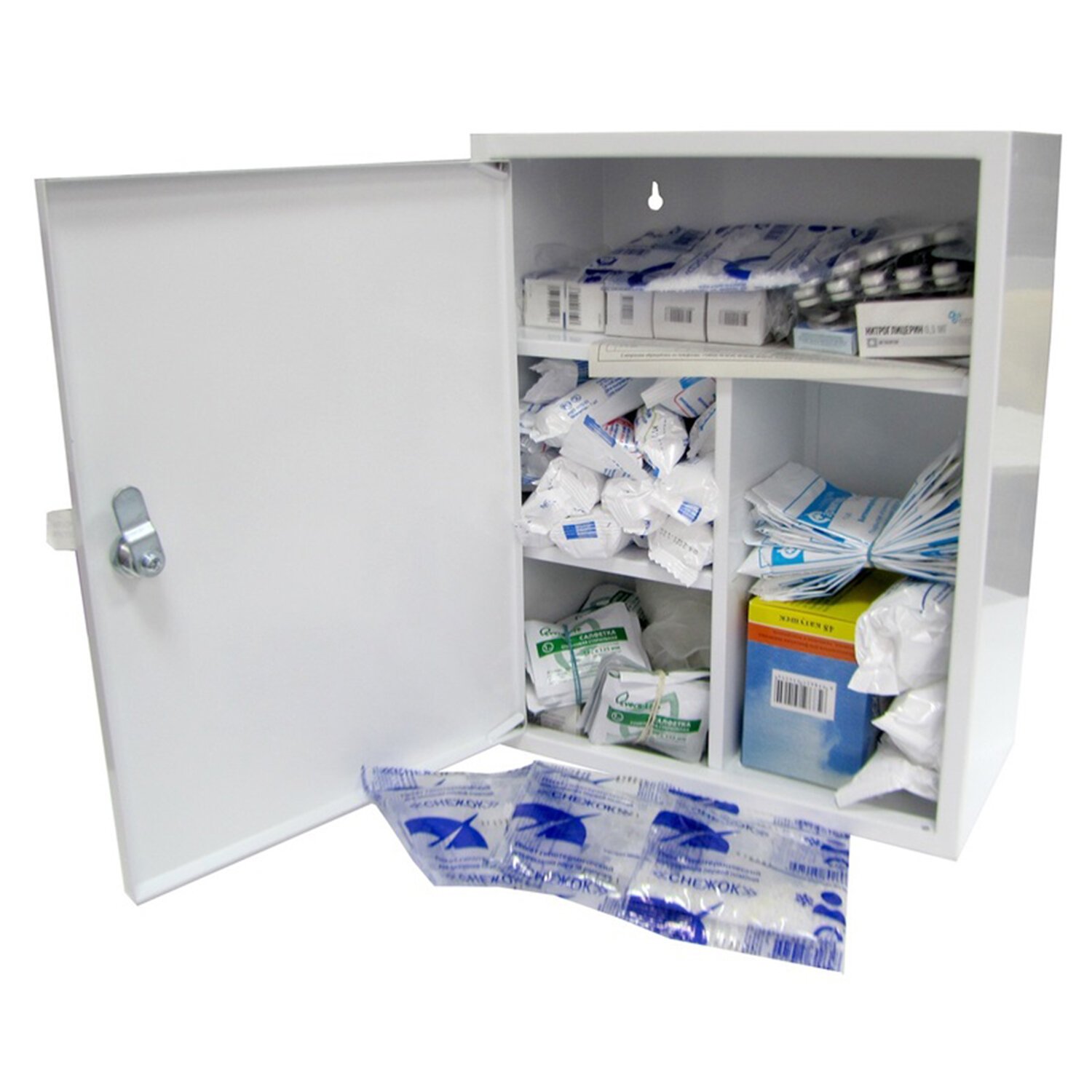 Аптечка первой помощи "ФЭСТ" коллективная №3 в металлическом шкафу предназначена для оснащения крупных производственных предприятий, учреждений и производств, рассчитана на 100 человек. Комплектация включает средства для оказания первой помощи при травмах и неотложных состояниях. Изделие доступно оптом, поставляется напрямую от производителя с возможностью доставки по всей РФ.Характеристики