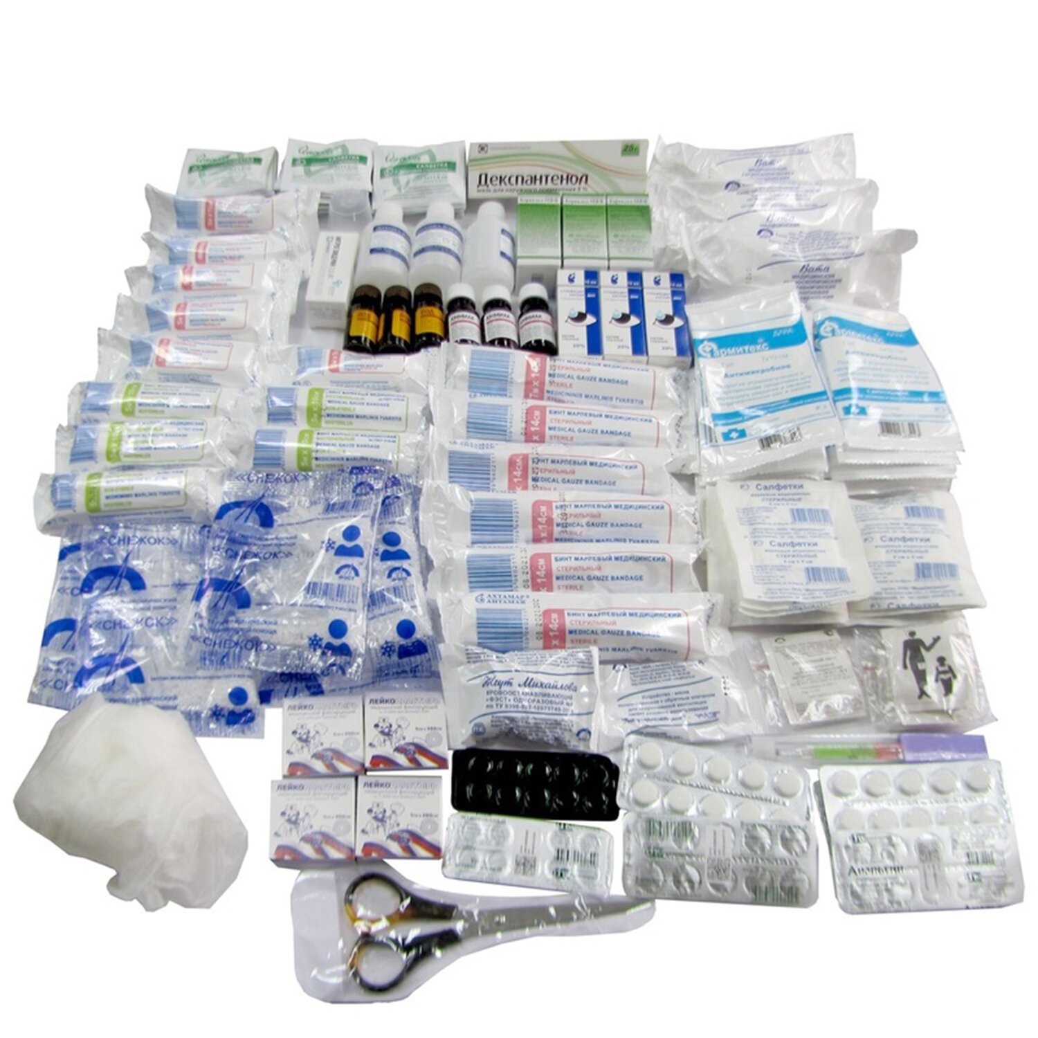 Состав: Анальгин, табл. 500 мг №10 – 3 уп. Гипотермический (охлаждающий) пакет – 5 уп. Жгут кровоостанавливающий – 1 шт. Бинт стерильный 5 м x 10 см или 5 м x 7 см – 6 шт. Бинт стерильный 7 м x 14 см – 6 шт. Бинт нестерильный 5 м x 10 см – 5 шт. Атравматическая антимикробная салфетка 6 x 10 см №1 – 20 шт. Салфетки антисептические спиртовые – 30 шт. Салфетки стерильные кровоостанавливающие 6 x 10 см или 7 x 10 см №3 – 20 шт. Раствор йода спиртовой 5%, 10 мл – 3 фл. Лейкопластырь 1 x 250 см – 4 шт. Бинт эластичный трубчатый медицинский нестерильный №6 – 3 шт. Вата нестерильная, 50 г – 3 уп. Сульфацил-натрия раствор 20%, 1 мл №2 тюбик-капельница или 5 мл флакон-капельница или по 10 мл – 3 уп. Перекиси водорода раствор 3%, 40 мл – 3 фл. Спрей «Олазоль» или Д-Пантенол мазь 5%, 25 г или Пантенол-ратиофарм 5%, 35 г – 1 шт. Нитроглицерин, капс. 0,5 мг №20 или табл. 0,5 мг №40 – 2 уп./1 уп. Валидол, табл. 60 мг №6 или №10 – 3 уп. Устройство для проведения искусственного дыхания «Рот-Устройство-Рот» – 1 уп. Аммиака раствор 10%, 10 мл или 40 мл – 3 фл. Уголь активированный, табл. 250 мг №10 – 3 уп. Корвалол, 15 мл – 3 фл. Ножницы – 1 шт. Стаканчик мерный – 1 шт. Термометр медицинский – 1 шт. Перчатки нестерильные – 8 пар. Футляр для аптечки – 1 шт.