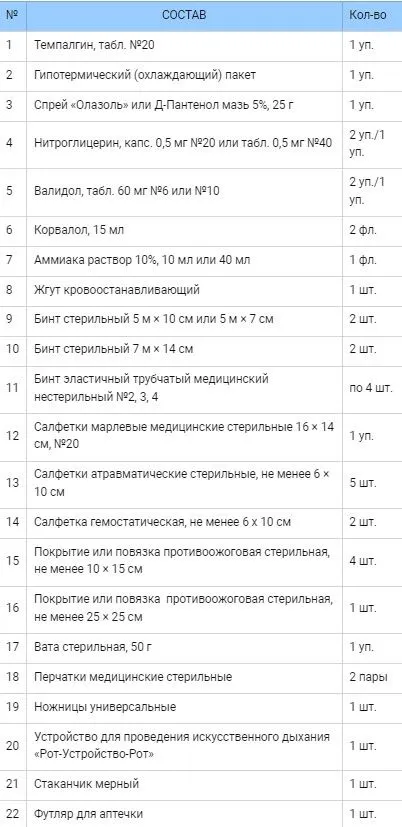 Состав: Темпалгин табл. №20 (1 уп.), Гипотермический пакет (1 уп.), Спрей «Олазоль» или Д-Пантенол мазь 5% 25 г (1 уп.), Нитроглицерин 0,5 мг №20 или табл. 0,5 мг №40 (2 уп./1 уп.), Валидол 60 мг №6 или №10 (2 уп./1 уп.), Корвалол 15 мл (2 фл.), Аммиака раствор 10% 10 мл или 40 мл (1 фл.), Жгут кровоостанавливающий (1 шт.), Бинт стерильный 5 м × 10 см или 5 м × 7 см (2 шт.), Бинт стерильный 7 м × 14 см (2 шт.), Бинт эластичный трубчатый медицинский нестерильный №2, 3, 4 (по 4 шт.), Салфетки марлевые медицинские стерильные 16 × 14 см №20 (1 уп.), Салфетки атравматические стерильные не менее 6 × 10 см (5 шт.), Салфетки или покрытия гемостатические не менее 6 х 10 см (2 шт.), Покрытия или повязки стерильные противоожоговые не менее 10 × 15 см (4 шт.), Покрытия или повязки стерильные противоожоговые не менее 25 × 25 см (1 шт.), Вата стерильная 50 г (1 уп.), Перчатки стерильные (2 пары), Ножницы универсальные (1 шт.), Устройство для проведения искусственного дыхания «Рот-Устройство-Рот» (1 шт.), Стаканчик мерный (1 шт.)