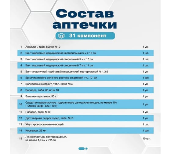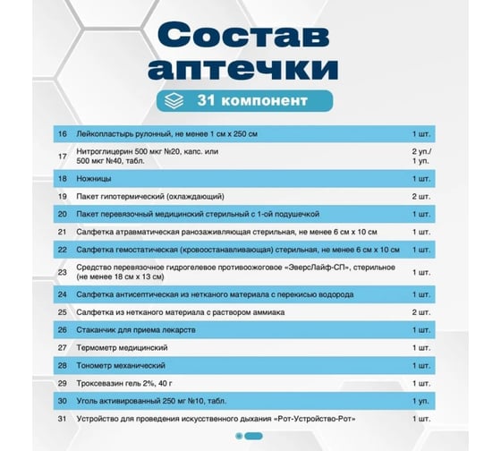 Комплектация: Анальгин 500 мг №10 (1 уп.), Бинт марлевый медицинский нестерильный 5 м х 10 см (1 шт.), Бинт марлевый медицинский стерильный 5 м х 10 см (1 шт.), Бинт марлевый медицинский стерильный 7 м х 14 см (1 шт.), Бинт эластичный трубчатый медицинский нестерильный №1,3,6 (1 уп.), Бриллиантового зеленого раствор спиртовой 1% 10 мл (1 фл.), Валерианы экстракт 20 мг №10 (1 уп.), Валидол 60 мг №10 (1 уп.), Вата нестерильная 50 г (1 уп.), Средство перевязочное гидрогелевое ранозаживляющее не менее 10 г («ЭверсЛайф-Гель» 10 г) (1 уп.), Папазол №10 (1 уп.), Дротаверина гидрохлорид №10 (1 уп.), Жгут кровоостанавливающий (1 шт.), Корвалол 15 мл (1 фл.), Лейкопластырь бактерицидный не менее 1,9 см х 7,2 см (10 шт.), Лейкопластырь рулонный не менее 1 см х 250 см (1 шт.), Нитроглицерин 500 мкг №20, капс. или 500 мкг №40, табл. (1 уп.), Ножницы (1 шт.), Пакет гипотермический (охлаждающий) (2 шт.), Пакет перевязочный медицинский стерильный с 1-ой подушечкой (1 шт.), Салфетка атравматическая ранозаживляющая Фармитекс ДЛРА 7 см х 10 см (1 шт.), Салфетка гемостатическая Фармитекс Гем ИАк 7 см х 10 см (1 шт.), Средство перевязочное гидрогелевое противоожоговое «ЭверсЛайф-СП», стерильное 18 см х 13 см (1 шт.), Салфетка антисептическая из нетканого материала с перекисью водорода (1 шт.), Салфетка из нетканого материала с раствором аммиака (2 шт.), Стаканчик для приема лекарств (1 шт.), Термометр медицинский (1 шт.), Тонометр механический (1 шт.), Троксевазин гель 2% 40 г (1 шт.), Уголь активированный 250 мг №10 (1 уп.), Устройство для проведения искусственного дыхания «Рот-Устройство-Рот» (1 шт.)
