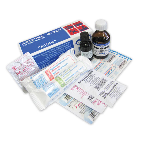 Состав: Анальгин 500 мг №10 (1 уп.), Ацетилсалициловая кислота 500 мг №10 (1 уп.), Бинт стерильный 5 м х 10 cм или 5 м х 7 см (1 шт.), Бинт нестерильный 5 м х 10 см или 5 м х 7 см (1 шт.), Бриллиантового зеленого раствор 1% 10 мл (1 фл.), Валидол 60 мг №6 или №10 (1 уп.), Аммиака раствор 10% 10 мл или 40 мл, или салфетка для стимуляции дыхания (1 фл./ 1 шт.), Уголь активированный 250 мг №10 (1 уп.), Лейкопластырь бактерицидный не менее 1,9 см x 7,2 см (3 шт.)