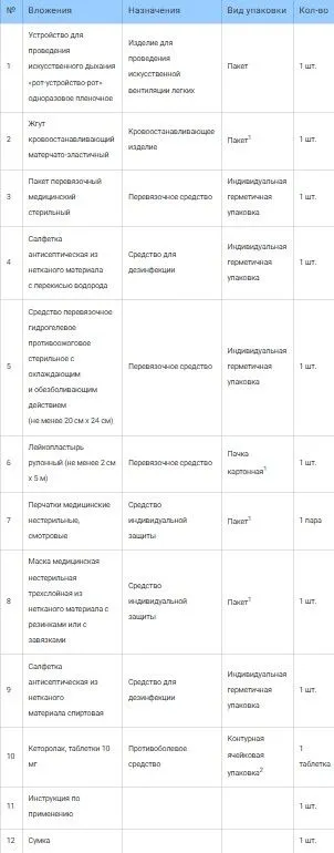 Состав: Устройство для проведения искусственного дыхания «рот-устройство-рот» (1 шт.), Жгут кровоостанавливающий матерчато-эластичный (1 шт.), Пакет перевязочный медицинский стерильный (1 шт.), Салфетка антисептическая с перекисью водорода (1 шт.), Средство перевязочное гидрогелевое противоожоговое стерильное не менее 20 см x 24 см (1 шт.), Лейкопластырь рулонный не менее 2 см x 5 м (1 шт.), Перчатки медицинские нестерильные (1 пара), Маска медицинская нестерильная (1 шт.), Салфетка антисептическая спиртовая (1 шт.), Кеторолак, таблетки 10 мг (1 таблетка), Инструкция по применению (1 шт.)