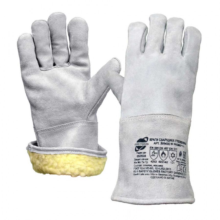 Краги спилковые утепленные Arcticus 200435 W представляют собой пятипалые краги для сварочных и других работ в холодных условиях. Изделие поставляется оптом от производителя с доставкой по всей РФ. Краги изготовлены из серого спилка КРС класса АВ, утеплены искусственным белым мехом типа «барашек» в ладонной части, подкладка в краге выполнена из хлопчатобумажного материала. Длина краги составляет 350-360 мм, ширина раструба — 17 мм.Характеристики