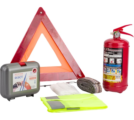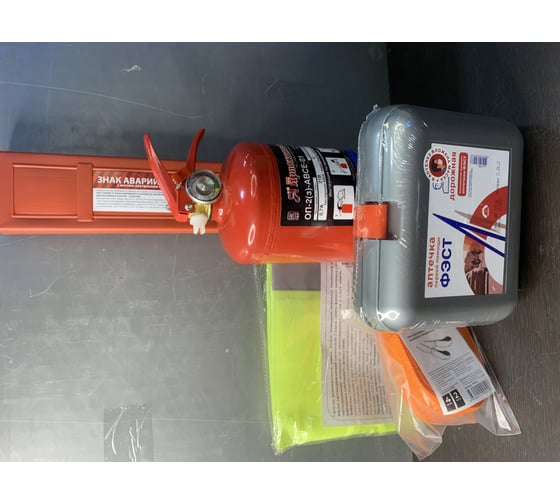 Комплектация: Аптечка первой помощи дорожная «ФЭСТ», огнетушитель металлический ОП-2(з), знак аварийной остановки, трос буксировочный (грузоподъемность 3.5 т, длина 4 м, с петлями), жилет сигнальный, сумка-футляр