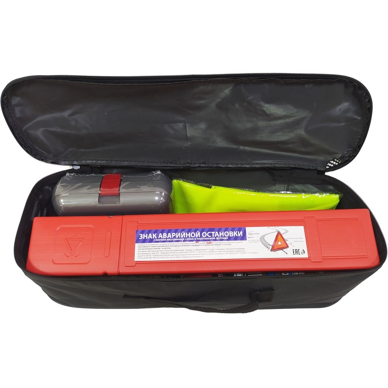 Набор применяется для оснащения транспортных средств в соответствии с обязательными требованиями для прохождения технического осмотра. Используется для оказания первой помощи, тушения возгораний, обозначения места аварийной остановки, буксировки транспортного средства, защиты рук и обеспечения видимости водителя вне автомобиля.