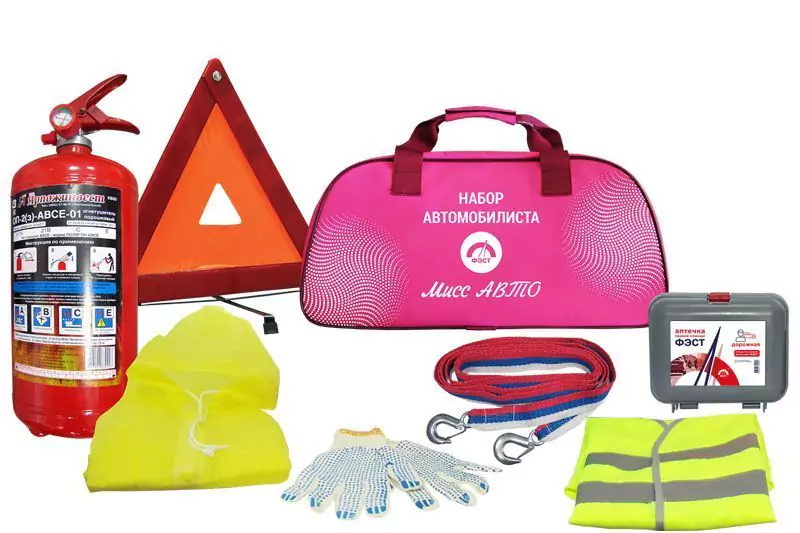 Комплектация: Аптечка первой помощи дорожная «ФЭСТ», огнетушитель металлический ОП-2(з), знак аварийной остановки, трос буксировочный (грузоподъемность 3.5 т, длина 4 м, с крюками), плащ-дождевик, перчатки с ПВХ, жилет сигнальный, сумка-футляр "Мисс Авто"