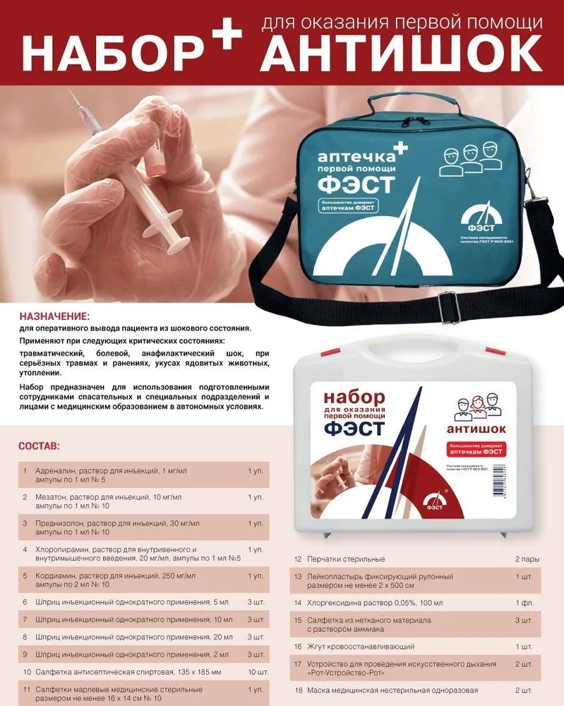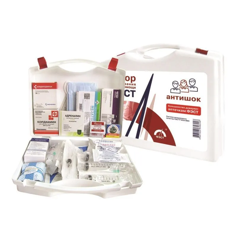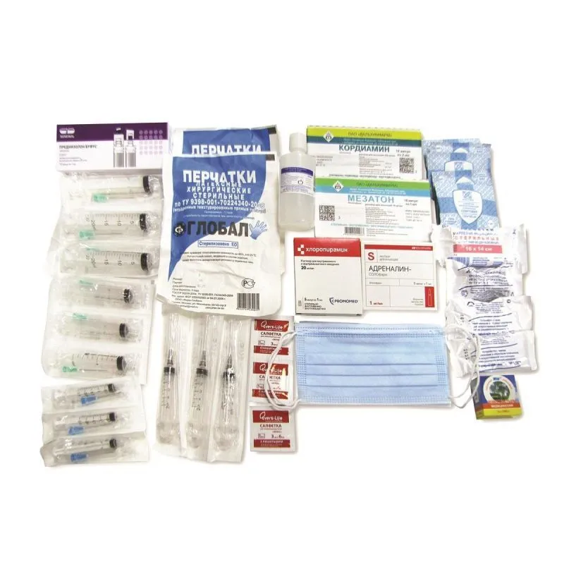 Состав: Адреналин, раствор для инъекций 1 мг/мл, ампулы по 1 мл №5 (1 уп.), Мезатон, раствор для инъекций 10 мг/мл, ампулы по 1 мл №10 (1 уп.), Преднизолон, раствор для инъекций 30 мг/мл, ампулы по 1 мл №10 (1 уп.), Хлоропирамин, раствор для внутривенного и внутримышечного введения 20 мг/мл, ампулы по 1 мл №5 (1 уп.), Кордиамин, раствор для инъекций 250 мг/мл, ампулы по 2 мл №10 (1 уп.), Шприц инъекционный однократного применения 5 мл (3 шт.), Шприц инъекционный однократного применения 10 мл (3 шт.), Шприц инъекционный однократного применения 20 мл (8 шт.), Шприц инъекционный однократного применения 2 мл (3 шт.), Салфетка антисептическая спиртовая 135 х 185 мм (10 шт.), Салфетки марлевые медицинские стерильные 16 х 14 см №10 (1 уп.), Перчатки стерильные (2 пары), Лейкопластырь фиксирующий рулонный 2 х 500 см (1 шт.), Хлоргексидина раствор 0,05% 100 мл (1 фл.), Салфетка с раствором аммиака (3 шт.), Жгут кровоостанавливающий (1 шт.), Устройство для проведения искусственного дыхания «Рот-Устройство-Рот» (2 шт.), Маска медицинская нестерильная одноразовая (2 шт.)