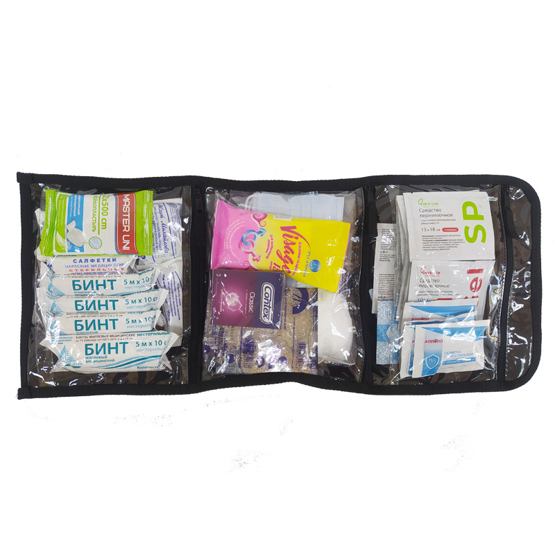 Состав: Бинт марлевый медицинский нестерильный 5 м х 10 см (4 шт.), Салфетка для стимуляции дыхания с аммиаком 3 см х 6 см (4 шт.), Салфетка антисептическая с перекисью водорода (4 шт.), Средство перевязочное гидрогелевое противоожоговое «ЭверсЛайф-Гель» 10 г стерильное (4 шт.), Средство перевязочное гидрогелевое противоожоговое «ЭверсЛайф-СП» стерильное (4 шт.), Средство перевязочное гидрогелевое кровоостанавливающее «ЭверсЛайф-Гемо» стерильное (4 шт.), Лейкопластырь фиксирующий рулонный 2 см х 500 см (1 шт.), Лейкопластырь бактерицидный 1,9 см х 7,2 см (10 шт.), Салфетки медицинские стерильные 16 х 14 см №10 (2 уп.), Салфетка антисептическая спиртовая 135 мм х 185 мм (4 шт.), Хлоргексидина раствор 0,05% 100 мл (1 фл.), Пакет гипотермический «Снежок» (4 шт.), Перчатки нестерильные (2 пары), Маска медицинская нестерильная (4 шт.), Устройство для проведения искусственного дыхания «Рот-Устройство-Рот» (1 шт.), Жгут кровоостанавливающий (1 шт.), Ножницы для разрезания повязок (1 шт.), Салфетки для интимной гигиены не менее №15 (1 шт.), Презервативы №3 (2 уп.)