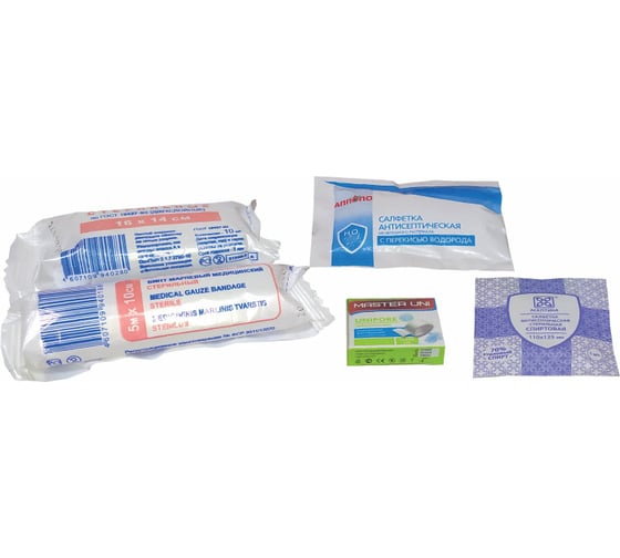 Комплектация: Салфетка антисептическая из нетканого материала с перекисью водорода 130х180 мм (1 шт.), Салфетка антисептическая спиртовая 110х125 мм (1 шт.), Салфетки медицинские стерильные, не менее 16х14 см №10 (1 уп.), Бинт марлевый медицинский стерильный 5 мх10 см (1 шт.), Лейкопластырь рулонный фиксирующий, размер не менее 1х250 см (1 шт.)