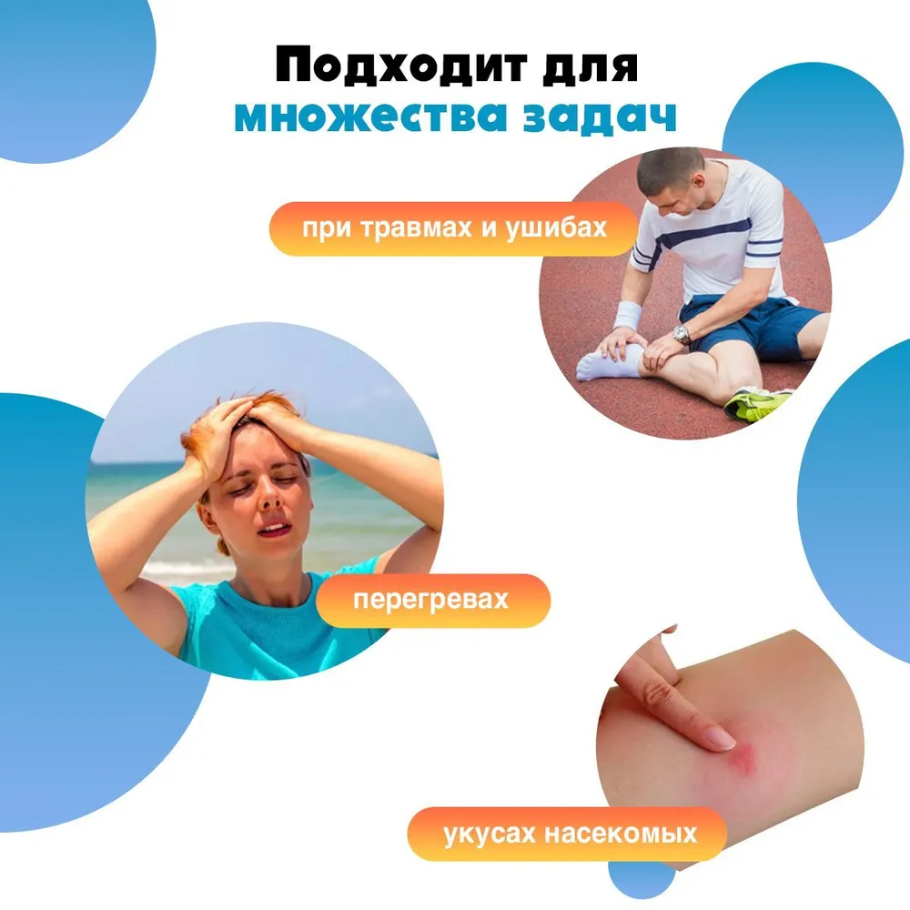 Изделие применяется для охлаждения места травмы с целью снижения отечности при ушибах, перегревах, растяжениях мышц и остановки незначительных кровотечений, например, при повреждениях носа или рассечении брови. Используется в спортивной медицине на соревнованиях, в бытовых условиях, а также в составе медицинских укладок и аптечек для оказания первой до врачебной помощи.