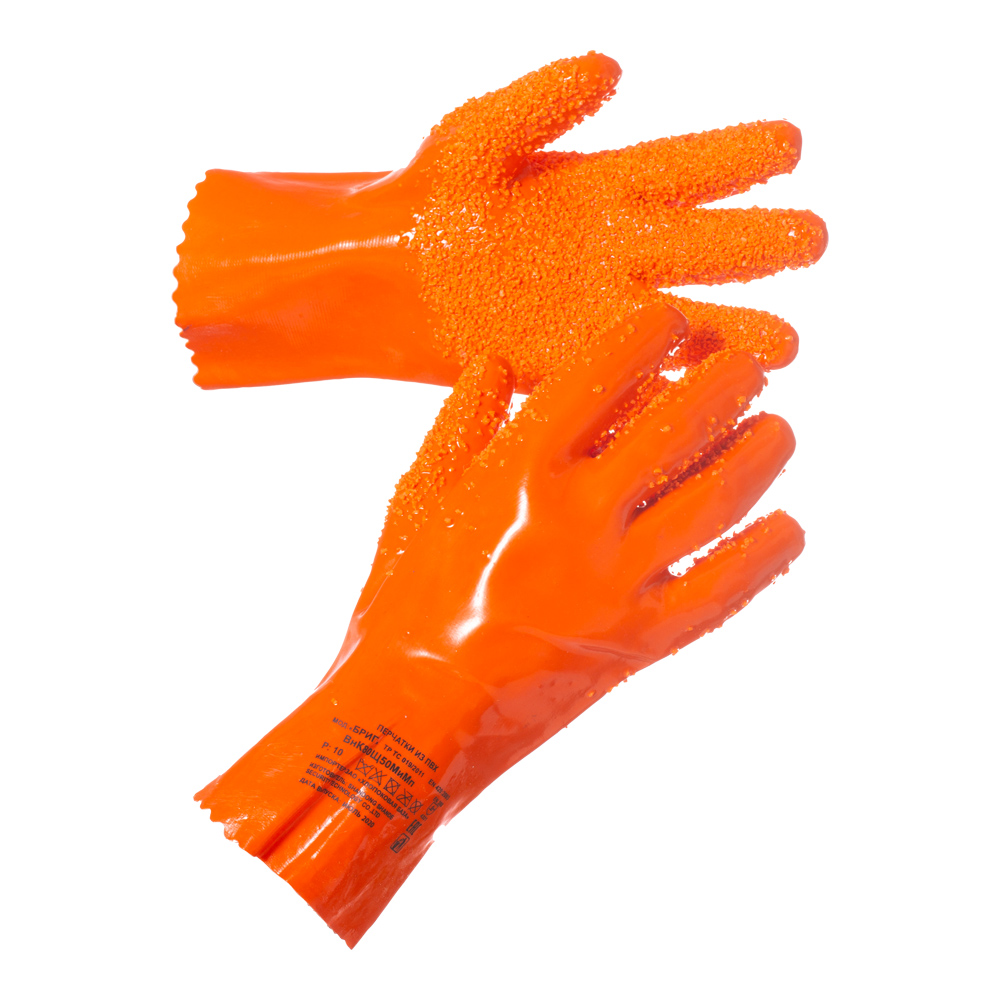 Перчатки «БРИГ» (код по каталогу: 136-0400-01) — водонепроницаемые перчатки из ПВХ для защиты от растворов кислот (до 80%) и щелочей (до 50%), от механических воздействий и общепроизводственных загрязнений. Резиновая крошка на ладонной части обеспечивает надёжный захват влажных предметов. Материал подкладки — полиэстер. Длина — 320 мм, толщина — 1,3 мм. Доступные размеры: 10, 11.