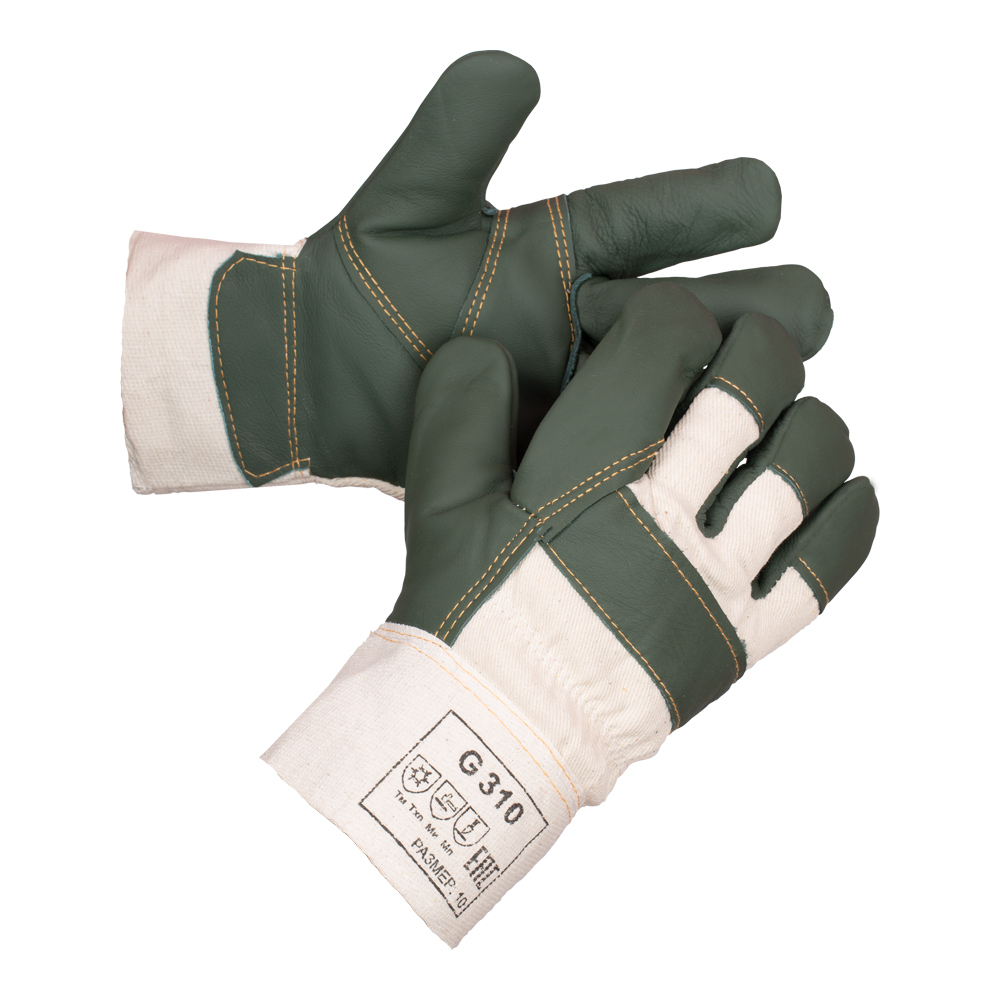 Перчатки G310 кожаные (код по каталогу: 136-0048-01) — комбинированные перчатки из искусственной кожи и 100% хлопка, утеплённые искусственным мехом (450 г/м²). Предназначены для работы при пониженных температурах во II и III климатических поясах, контакта с охлаждённой поверхностью, защиты от механических воздействий и общих производственных загрязнений. Подходят для ремонтных, строительно-конструкторских, сборочно-монтажных работ, технического обслуживания машин и механизмов. Цвет зависит от партии, длина — 280 мм, размер — 10.