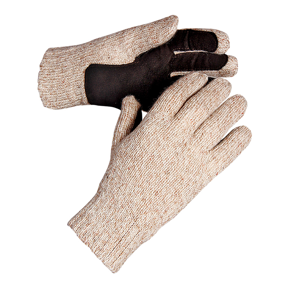 Перчатки ХАКСЫ бежевый меланж (код по каталогу: 136-0422-01). Вязаная основа из полушерстяной пряжи и утеплитель Тинсулейт обеспечивают защиту от пониженных температур во II и III климатических поясах. Спилковые накладки на ладонной части придают прочность и износостойкость.
