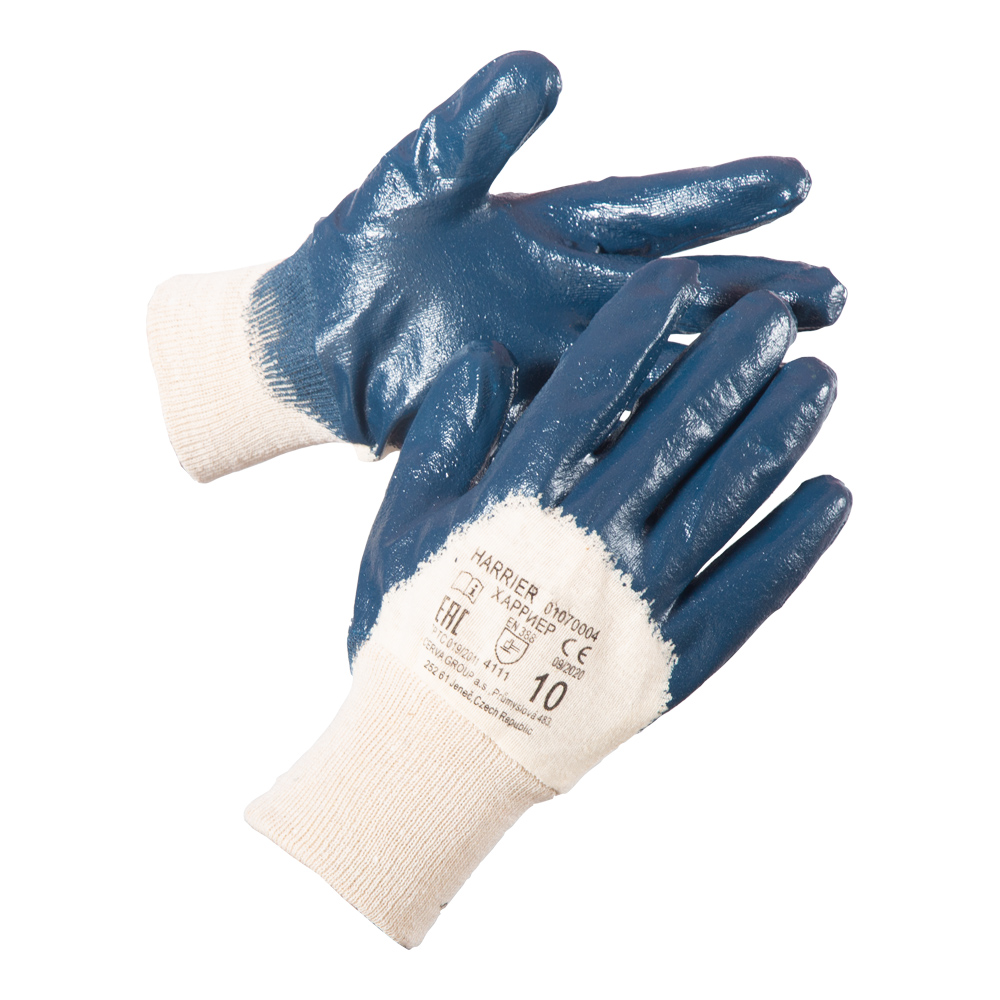 Перчатки ХАРРИЕР (код по каталогу: 136-0165-01) — экономичный вариант перчаток для грубых работ. Изготовлены из хлопкового джерси с частичным нитриловым покрытием (0,1 мм, одинарное обмакивание, шероховатая текстура). Манжета трикотажная, надёжно защищает запястье.