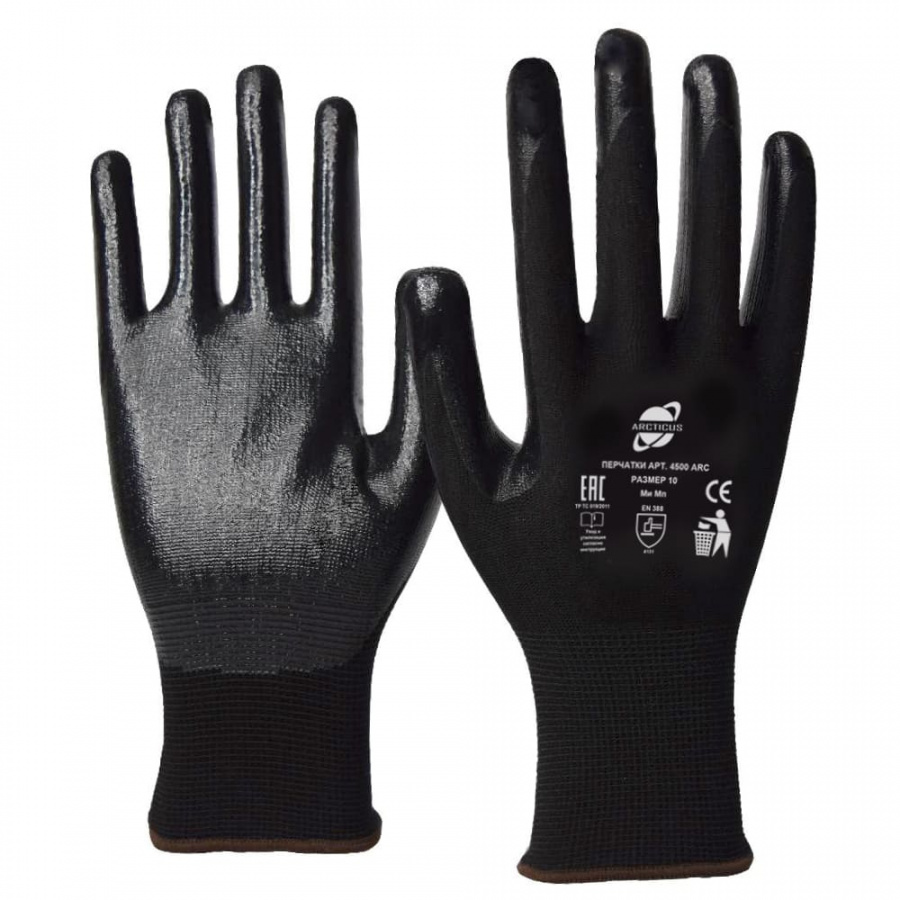 Полное наименование: Перчатки трикотажные п/э черные, с НИТРИЛОВЫМ черным покрытием на ладони и кончиках пальцев, 13G, 12/144, Arcticus, арт. 4500 ARCРазмерный ряд (РР перчатки): 07-11