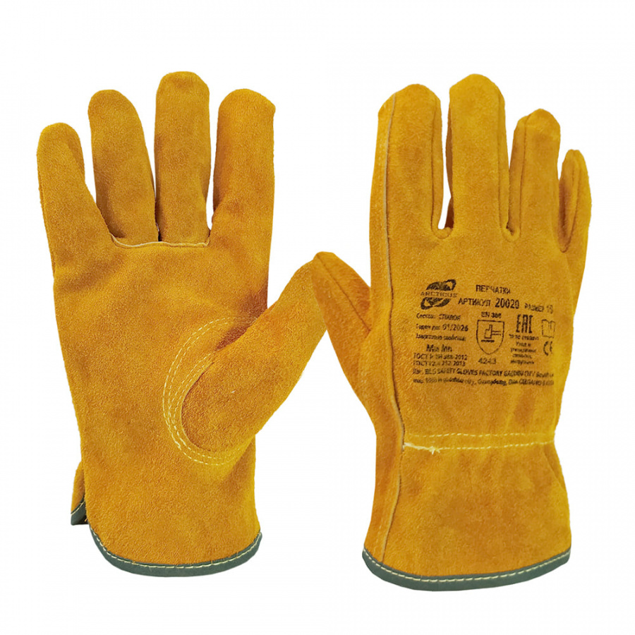 Полное наименование: Перчатки цельноспилковые из КРС желтого цвета, с резинкой на запястье. 12/120, Arcticus, арт. 20020Размерный ряд (РР перчатки): 09-11