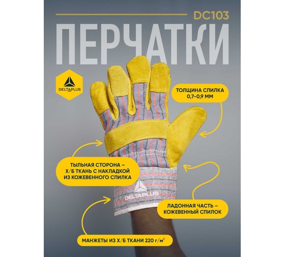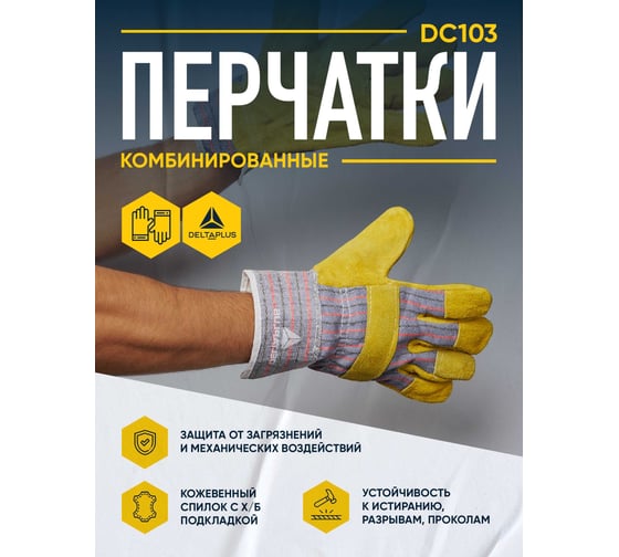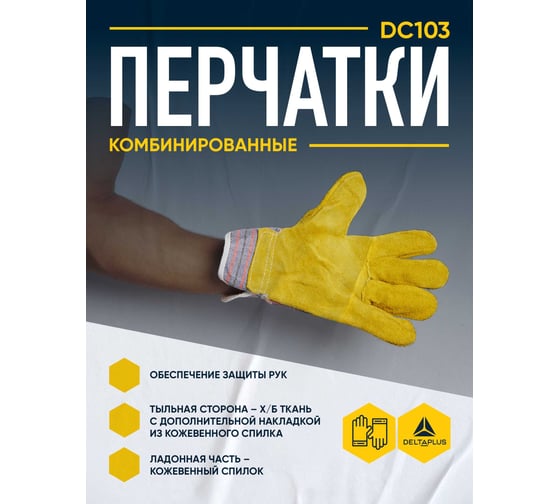 Комбинированные перчатки Delta Plus DC103 представляют собой перчатки комбинированной конструкции из кожевенного спилка и хлопчатобумажной ткани для защиты рук при проведении общих технических работ. Товар доступен к заказу оптом напрямую от производителя, возможна доставка по всей РФ.Характеристики
