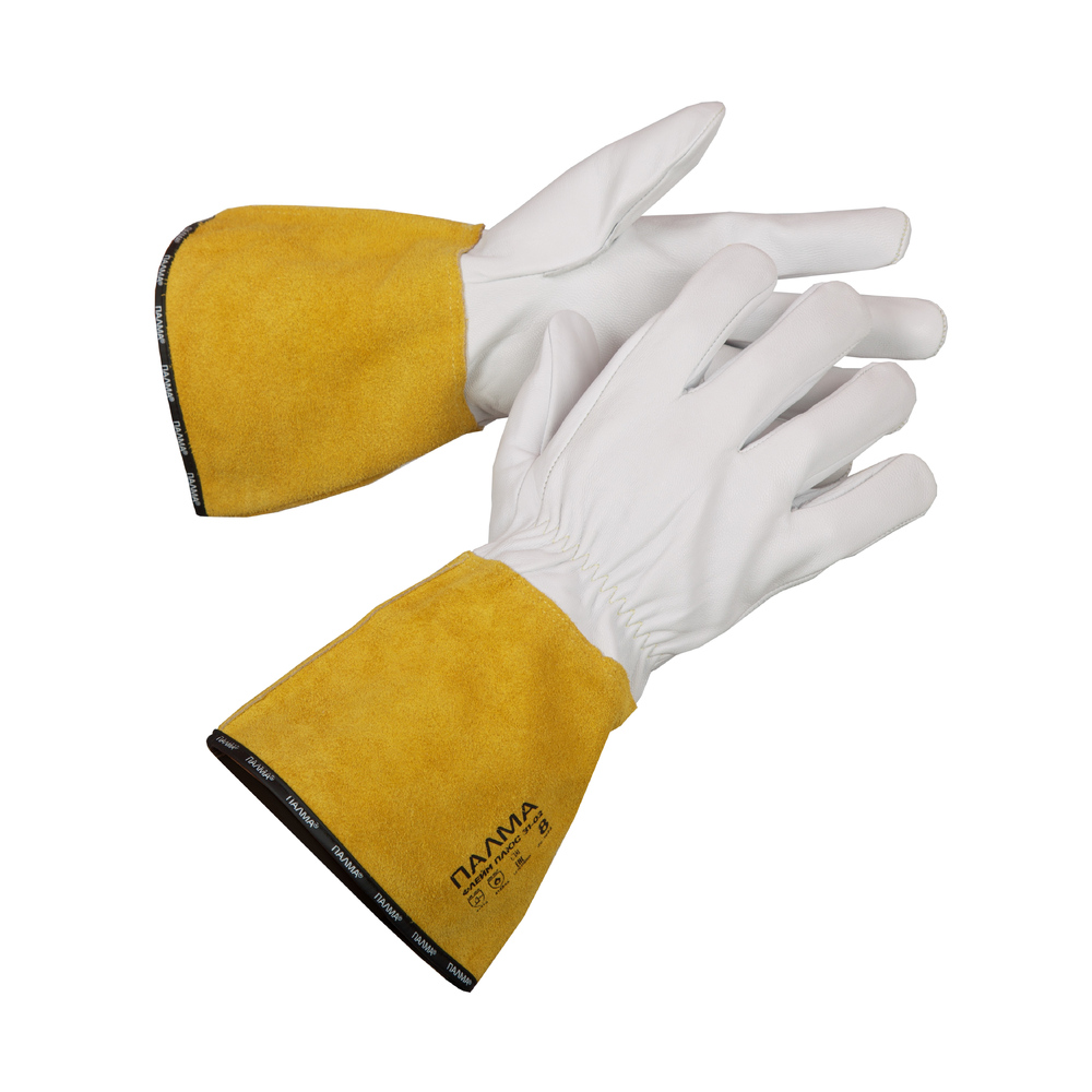 Перчатки ПАЛМА ФЛЕЙМ ПЛЮС 31-02 (код по каталогу: 136-0570-01) — сшитые из тонкой козьей кожи с крагой из спилка. Предназначены для защиты от повышенных температур (кратковременного воздействия открытого пламени, теплового излучения, конвективной теплоты, искр, брызг расплавленного металла, контакта с нагретыми поверхностями), а также от общих производственных загрязнений и механических воздействий (истирания, порезов, проколов).
