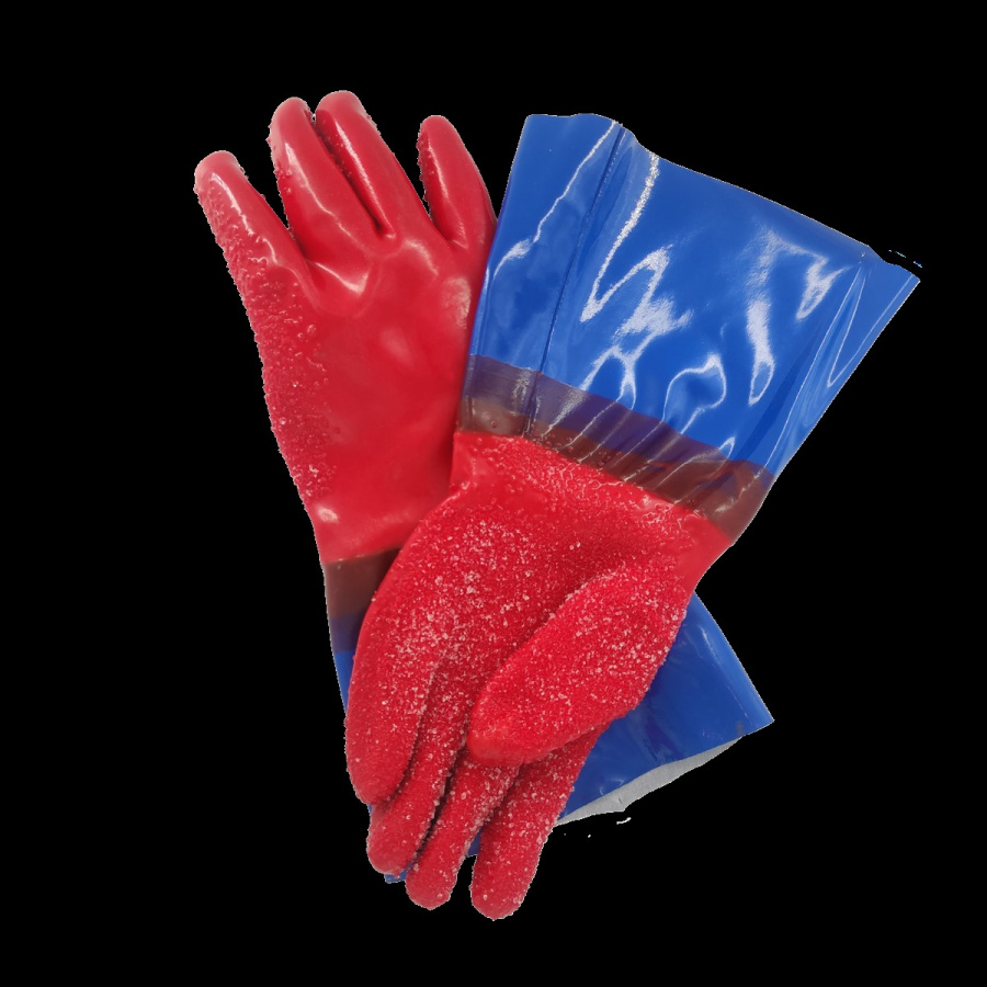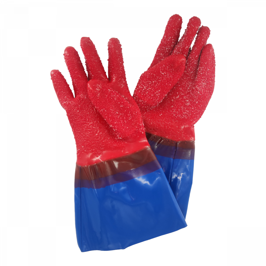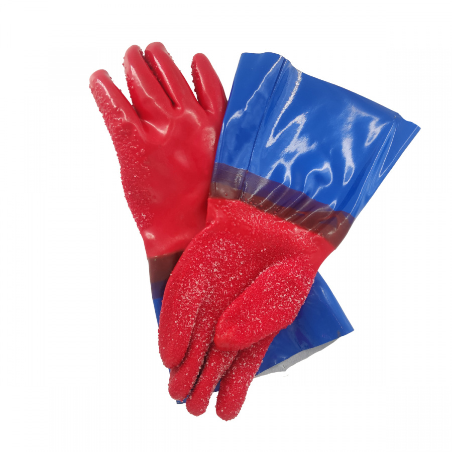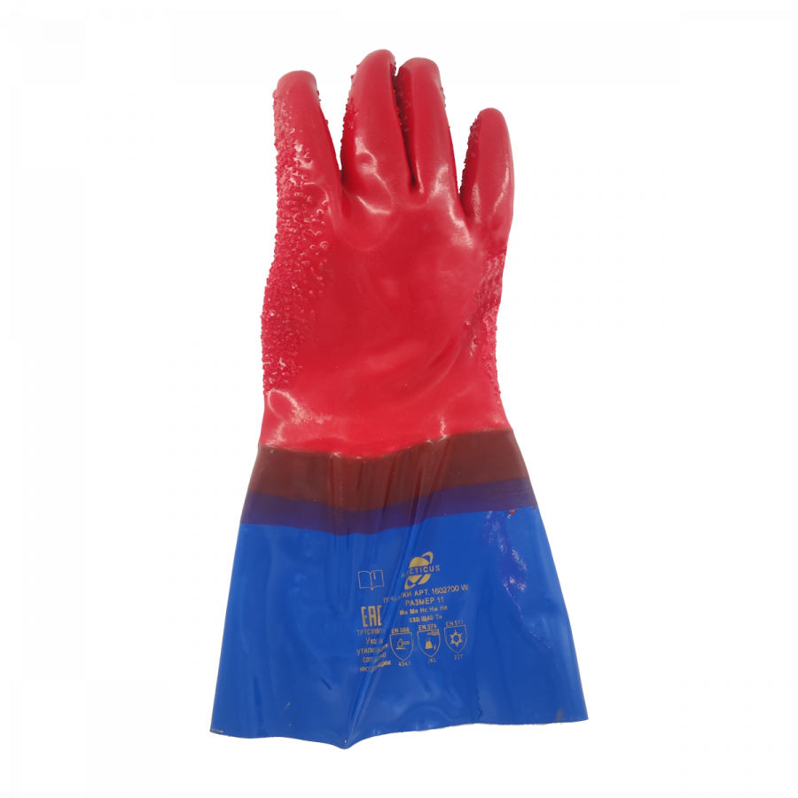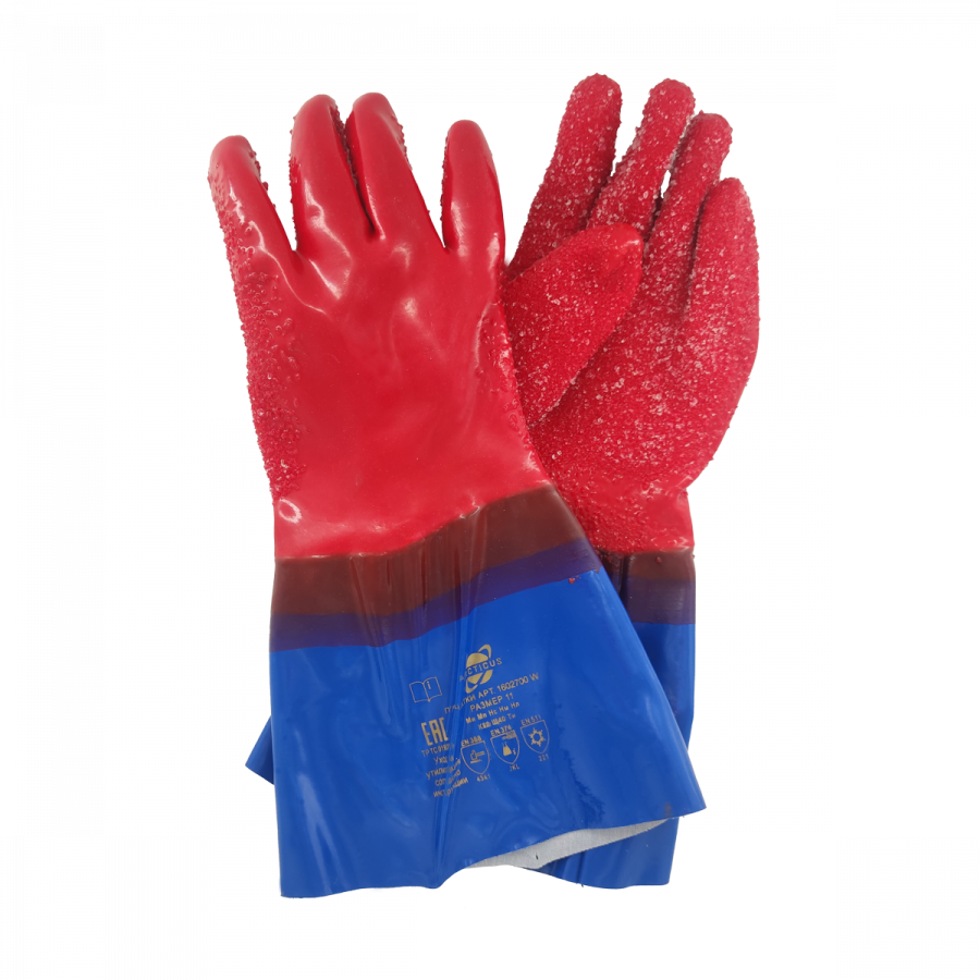 Перчатки рыбообработчика Arcticus 1602700W представляют собой пятипалые рабочие перчатки. Изделия поставляются оптом от производителя с доставкой по всей РФ. Основа выполнена трикотажной вязкой из хлопчатобумажного волокна и имеет полное поливинилхлоридное (ПВХ) покрытие. На ладони и пальцах нанесены прозрачные ПВХ-точки, образующие рельефную структуру для усиленного сцепления. Модель оснащена удлиненным манжетом в виде жесткой краги, общая длина изделия составляет примерно 30 см.Характеристики