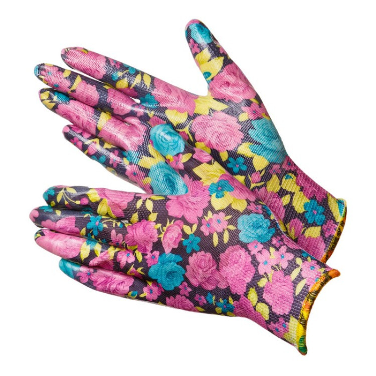 **Перчатки САДОВЫЕ нейлоновые с нитриловым покрытием** — продукция от производителя, доступная **оптом** с **доставкой по всей РФ**. Изделие представляет собой женские садовые перчатки из прочного **нейлона** с ярким дизайном. Модель отличается повышенной плотностью вязки (**13 класс**), хорошо тянется и плотно прилегает к рукам. Приятная на ощупь ткань не сковывает движений и сохраняет тактильную чувствительность пальцев. Прозрачное **нитриловое покрытие** защищает руки от натирания, порезов, загрязнения и намокания при работе с садовым инструментом и колючими растениями. Покрытие обладает **антискользящим эффектом**, что повышает безопасность и удобство при работе с инвентарём.