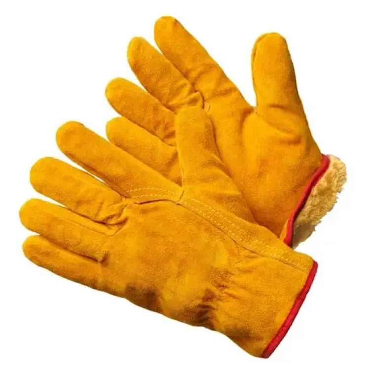 - **Название:** Перчатки цельноспилковые утеплённые ДРАЙВЕР. - **Материал:** спилок КРС (оранжевый), искусственный мех (утеплитель). - **Конструктивные особенности:** - цельноспилковая конструкция; - утягивающая резинка в манжете для лучшей фиксации на руке; - обработка края манжеты контрастной тесьмой; - утепление искусственным мехом. - **Защитные свойства:** - защита от искр; - защита от брызг металла; - защита от открытого пламени; - устойчивость к истиранию; - устойчивость к порезам; - теплоизоляция при работе в условиях пониженных температур.