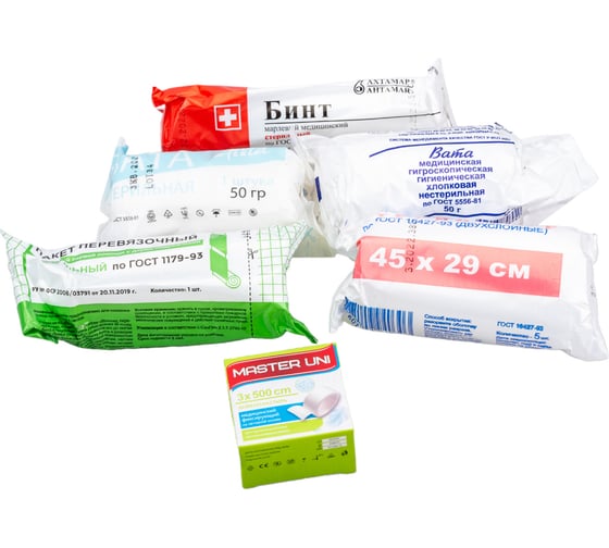 Комплектация: Аммиака раствор 10% (1 флакон), Раствор йода спиртовой 5% (1 флакон), Бинт стерильный 7 м х 14 см (5 шт), Бинт стерильный 5 м х 10 см (10 шт), Вата медицинская нестерильная 250 г или 50 г (1 уп/5 уп), Вата медицинская стерильная 50 г (2 уп), Косынка перевязочная (4 шт), Лейкопластырь 3х500 см, Пакет перевязочный медицинский стерильный (3 шт), Салфетки марлевые медицинские стерильные 16х14 см №20, Салфетки марлевые медицинские стерильные 45х29 см №10, Салфетка спиртовая антисептическая, Булавка безопасная (10 шт), Блокнот, Жгут кровоостанавливающий, Карандаш простой, Ножницы универсальные, Нож складной, Шприц одноразовый 2 мл (3 шт), Устройство для проведения искусственного дыхания «Рот-Устройство-Рот», Перчатки медицинские нестерильные