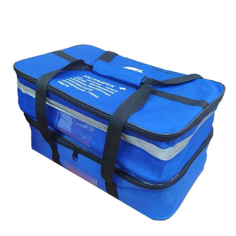 Основные позиции комплектации: Маска медицинская (10 шт.), перчатки (12 пар), устройство "Рот-Устройство-Рот" (6 шт.), жгут кровоостанавливающий (6 шт.), бинты марлевые (5м х 10 см – 12 шт., 7м х 14 см – 12 шт.), салфетки стерильные (12 уп.), покрывало спасательное (12 шт.), воротники-шины (4 шт.), комплекты шин иммобилизационных (3 шт.), дыхательный мешок (1 шт.), защитные очки (12 шт.), ножницы (6 шт.)