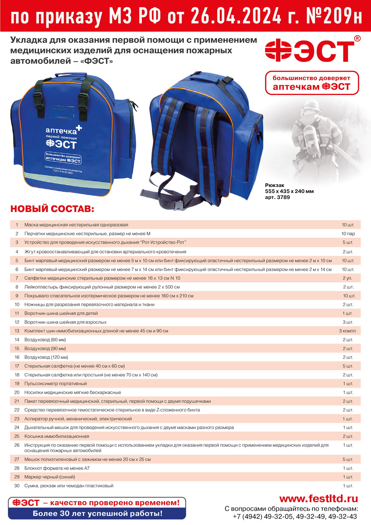 Укладка для оказания первой помощи с применением медицинских изделий предназначена для оснащения пожарных автомобилей. Комплектация артикула 3789 упакована в рюкзак и соответствует приказу Минздрава РФ №209н от 26.04.2024. Товар доступен к заказу оптом напрямую от производителя с доставкой по всей РФ.Характеристики
