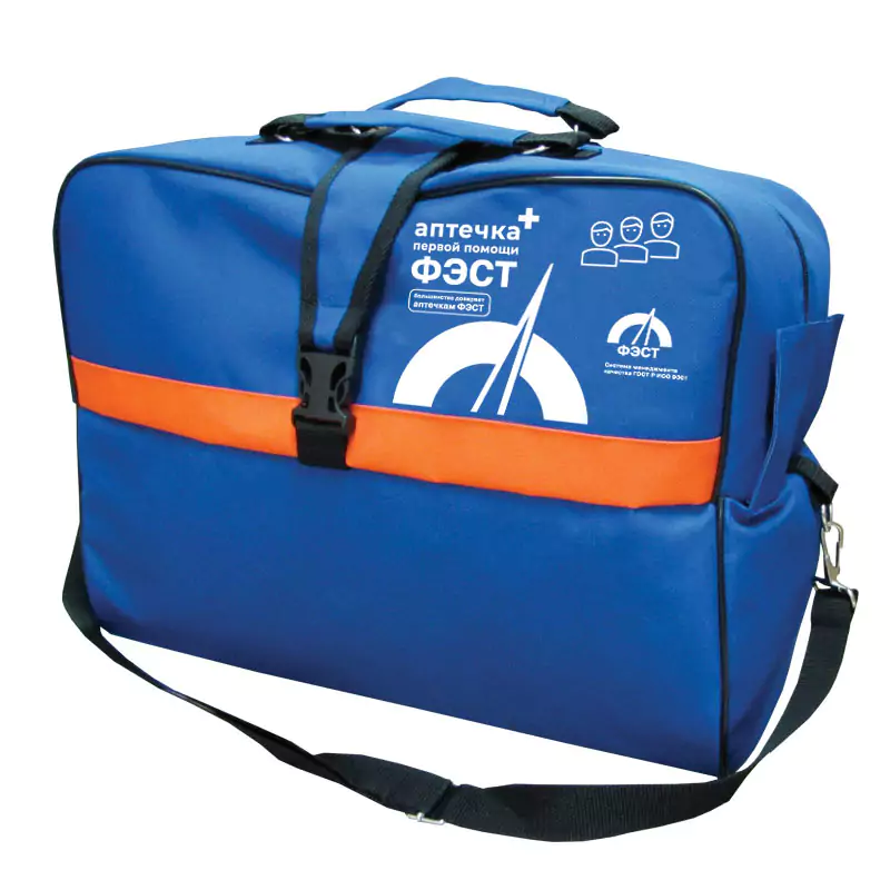 Основные позиции комплектации: Маска медицинская (10 шт.), перчатки (10 пар), устройство "Рот-Устройство-Рот" (2 шт.), дыхательный мешок (1 шт.), жгут кровоостанавливающий (2 шт.), бинты марлевые, салфетки стерильные, лейкопластыри, покрывало спасательное (2 шт.), воротники-шины (2 шт.), комплект шин иммобилизационных, носилки медицинские мягкие бескаркасные, термометр, измеритель артериального давления, ножницы