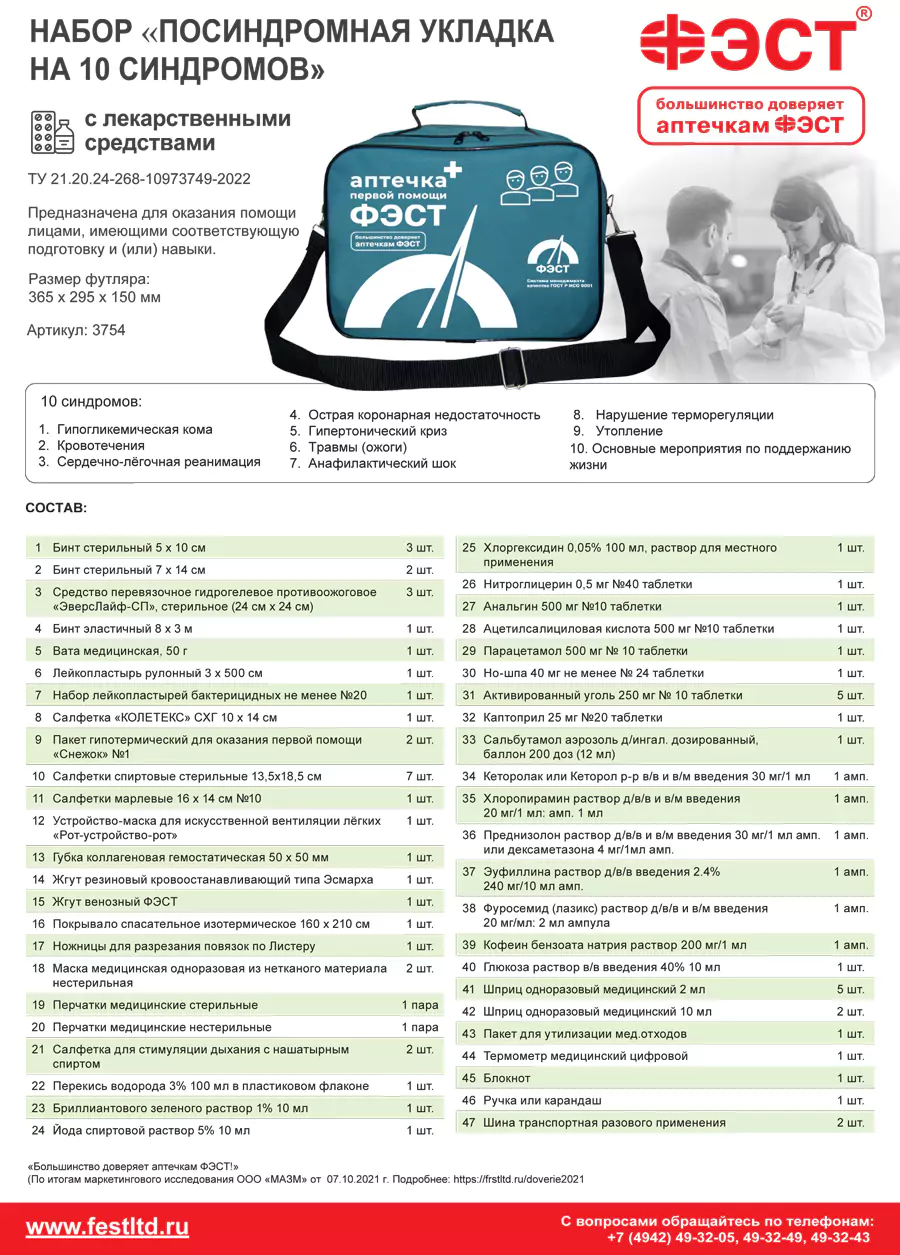 Укладка посиндромная (на 10 синдромов) с лекарственными средствами предназначена для оказания помощи лицами, имеющими соответствующую подготовку и навыки. Комплект модели м.3754 включает широкий набор медикаментов и средств для оказания помощи при различных синдромах и размещен в сумке. Товар доступен к заказу оптом от производителя с доставкой по всей РФ.Характеристики