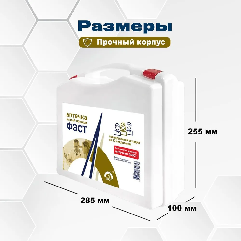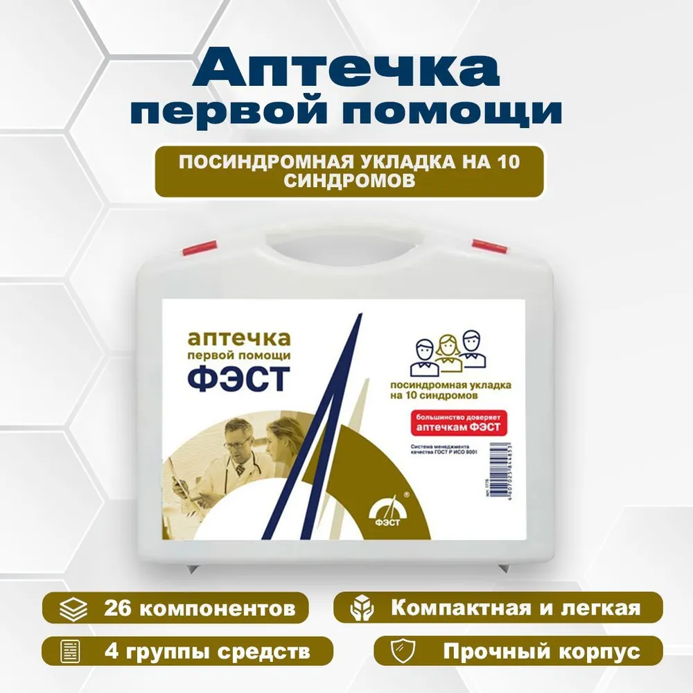 Состав: Изделия для остановки кровотечения и перевязки ран: Жгут кровоостанавливающий (1 шт.), Бинты марлевые нестерильные 5м х 7см, 5м х 10см, 7м х 14см (по 1 шт.), Бинты марлевые стерильные 5м х 7см, 5м х 10см, 7м х 14см (по 1 шт.), Салфетка «Колетекс» СФГ-ГЕМ 7,5 х 2,5 см с фурагином (1 уп.), Вата медицинская стерильная 25 г (1 уп.), Салфетки марлевые стерильные 16 х 14 см №10 (1 уп.), Лейкопластырь бактерицидный водостойкий №24 (1 уп.), Лейкопластырь бактерицидный 1,9 см х 7,2 см (20 шт.), Лейкопластырь рулонный 2 см х 500 см (1 шт.), Пакет гипотермический «Снежок» (1 шт.). Изделия для сердечно-легочной реанимации: Устройство для проведения искусственного дыхания «Рот-Устройство-Рот» (1 шт.). Прочие изделия: Ножницы для разрезания повязок (1 шт.), Салфетки антисептические стерильные спиртовые 13,5 x 18,5 см (7 шт.), Перчатки медицинские стерильные (1 пара), Маска медицинская нестерильная (3 шт.), Покрывало спасательное изотермическое 160 x 210 см (1 шт.), Бинт эластичный компрессионный 8 см х 3 м (1 шт.). Прочие средства: Список телефонов экстренных служб (1 шт.), Алгоритм действий сотрудника (1 шт.), Английские булавки стальные (3 шт.), Блокнот (1 шт.), Авторучка (1 шт.)