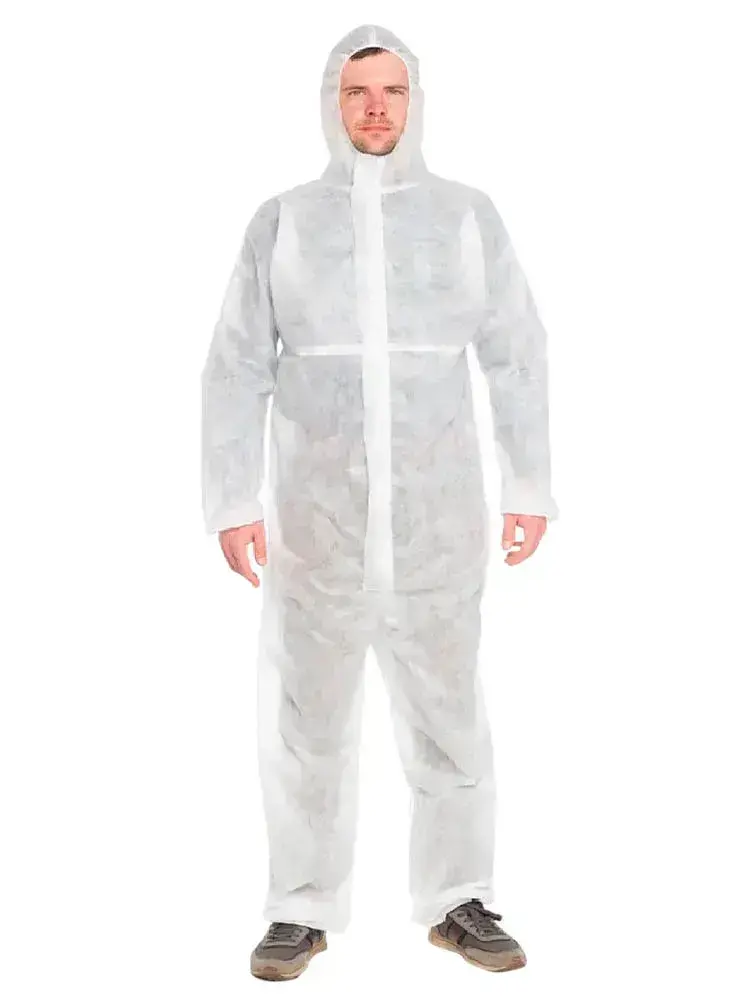 Комбинезон одноразовый c капюшоном закрывает не только тело с одеждой, но и волосы, что не требует использования дополнительной шапочки.