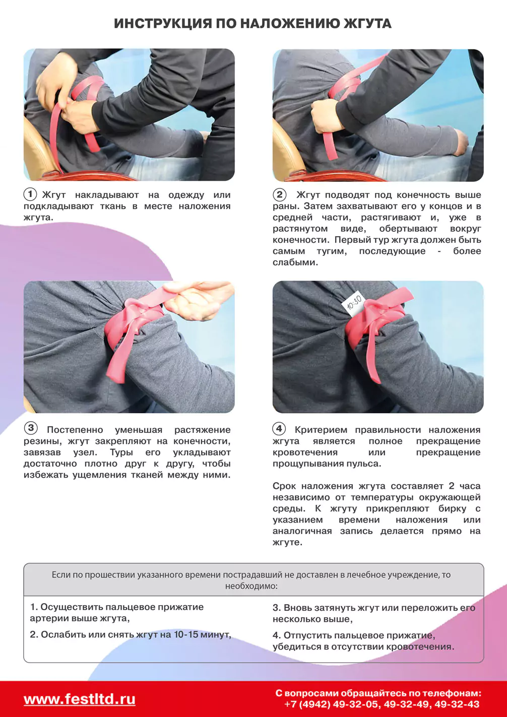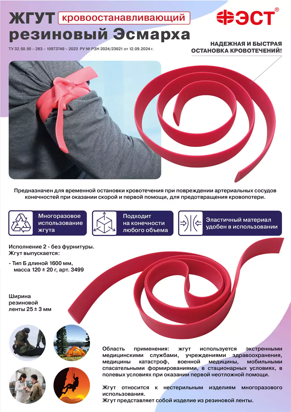 Жгут кровоостанавливающий резиновый Эсмарха ФЭСТ исполнение - 2 без фурнитуры, тип Б длиной 1600 мм предназначен для временной остановки артериального кровотечения при оказании скорой и первой помощи. Изделие относится к нестерильным изделиям многоразового использования. Поставка возможна оптом от производителя с доставкой по всей РФ.